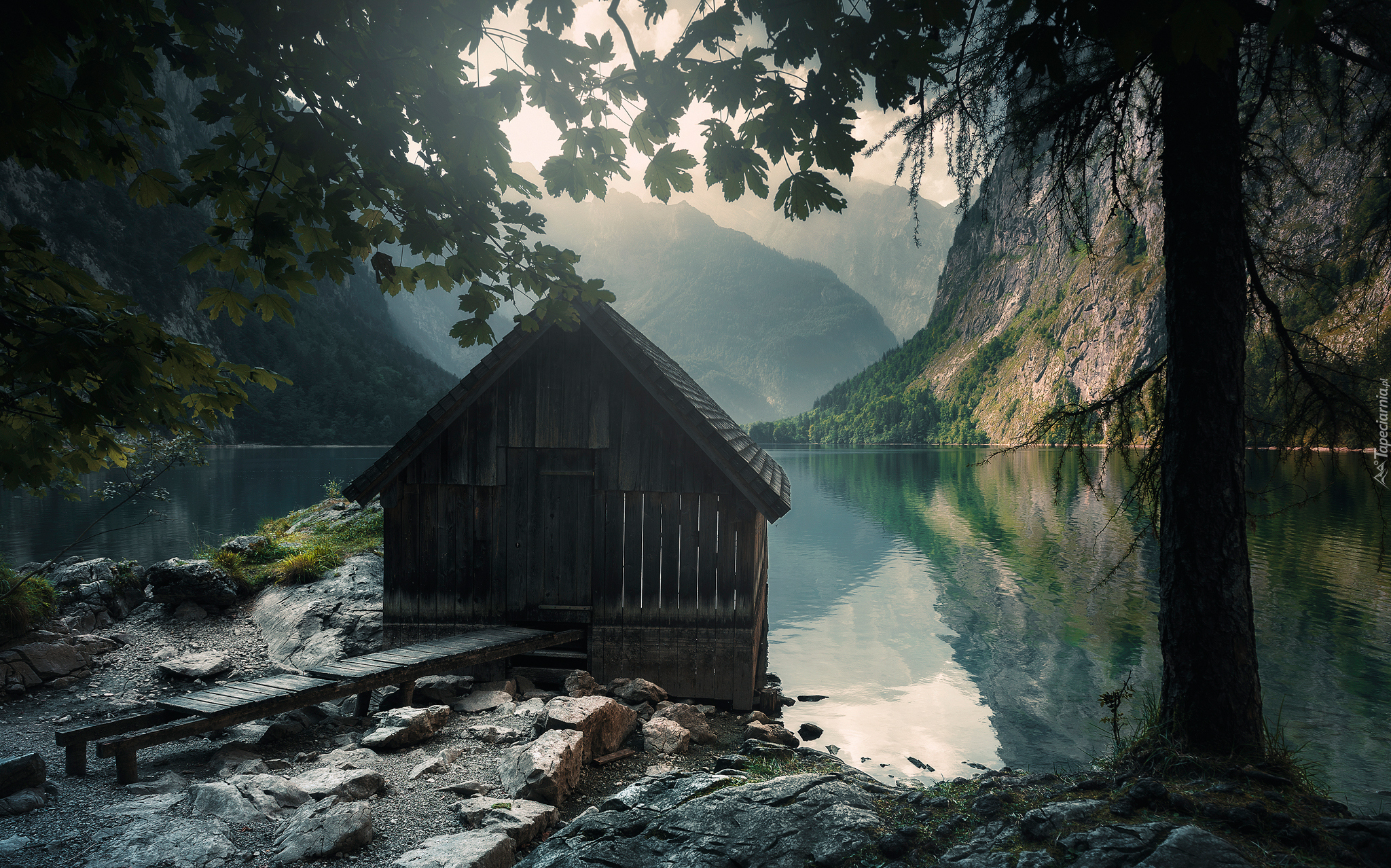 Edytor tapety: Drewniana chatka na brzegu jeziora Konigssee