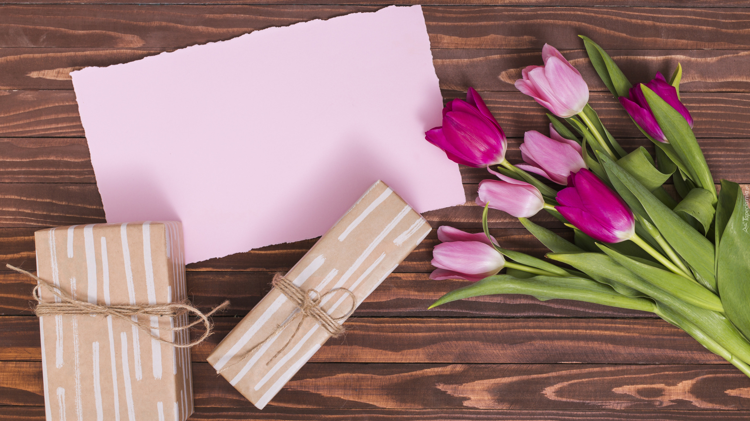 Edytor tapety: Prezenty obok kartki i tulipanów