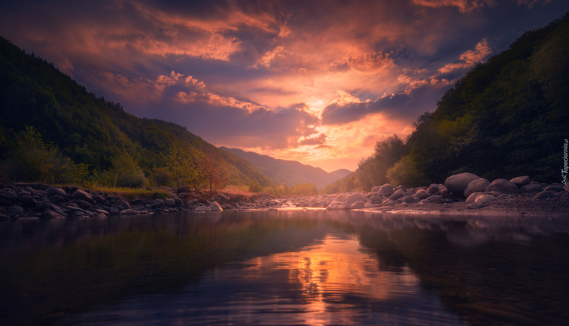 Edytor tapety: Zachód słońca nad kamienistym jeziorem i drzewami