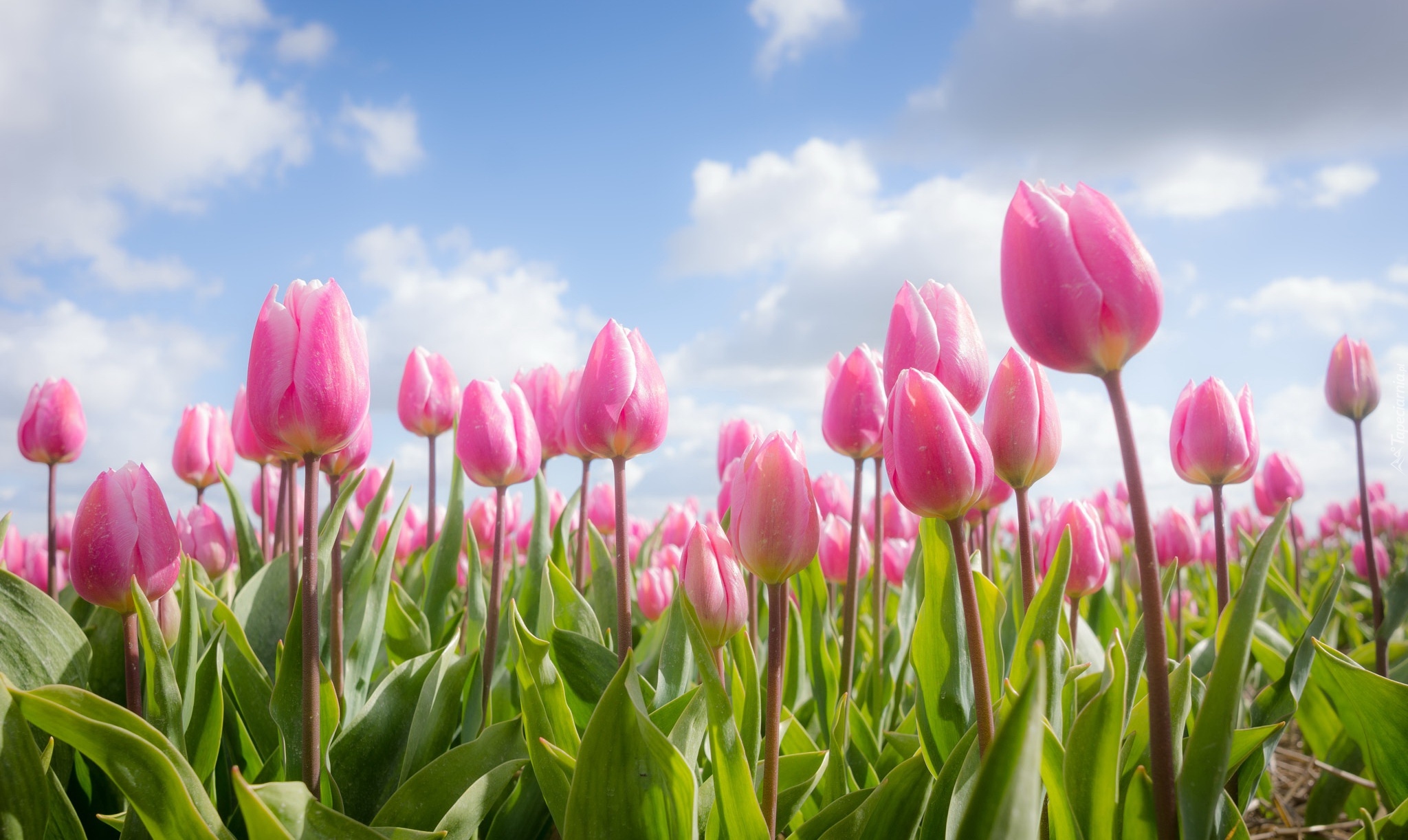Edytor tapety: Różowe tulipany na tle nieba i chmur