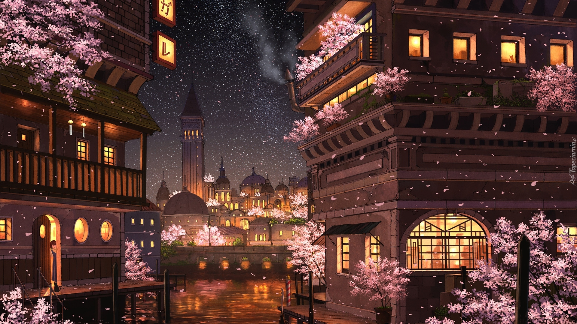 Edytor tapety: Kwitnące rośliny i drzewka obok domów