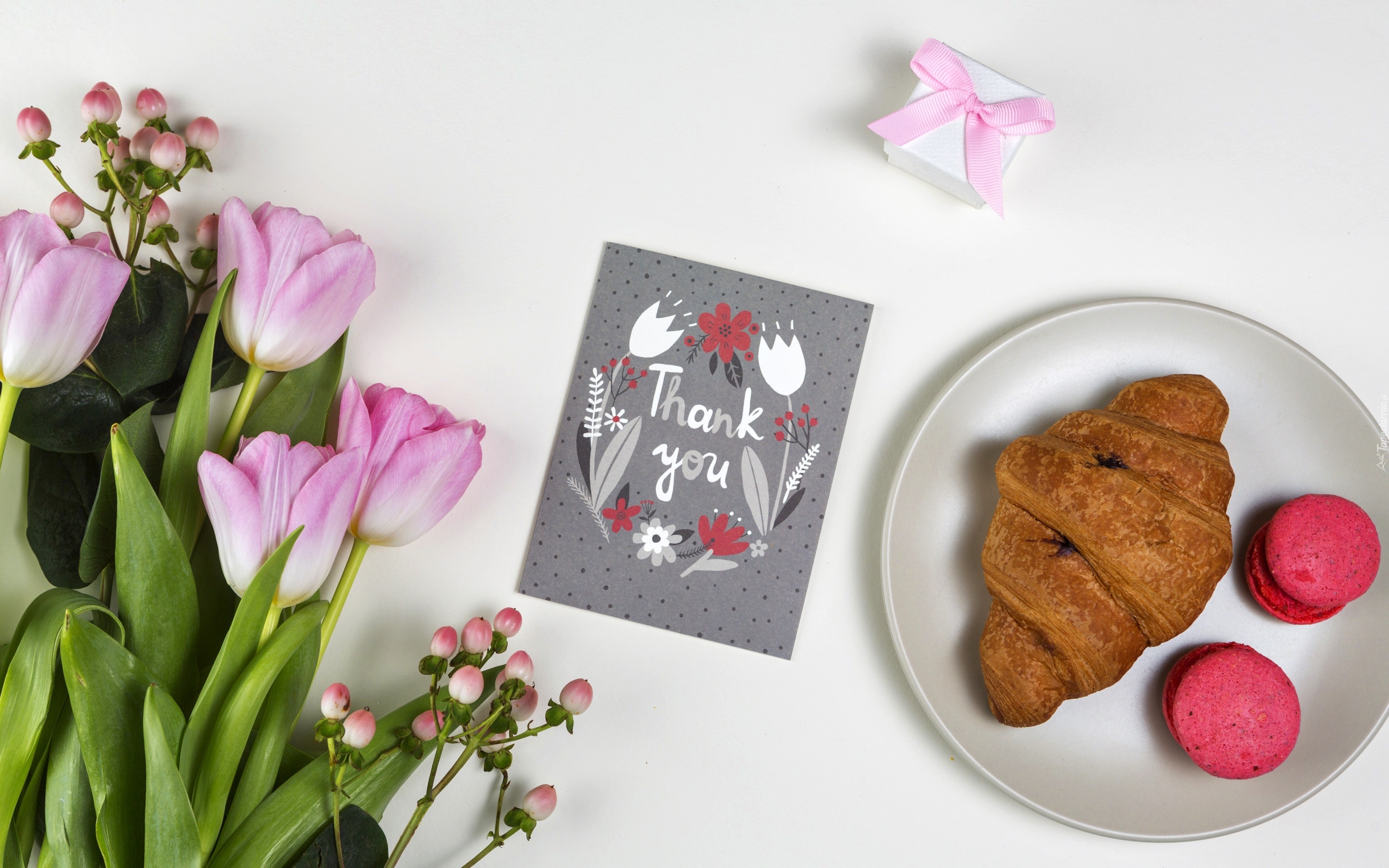 Edytor tapety: Kartka z podziękowaniem obok tulipanów i prezentu