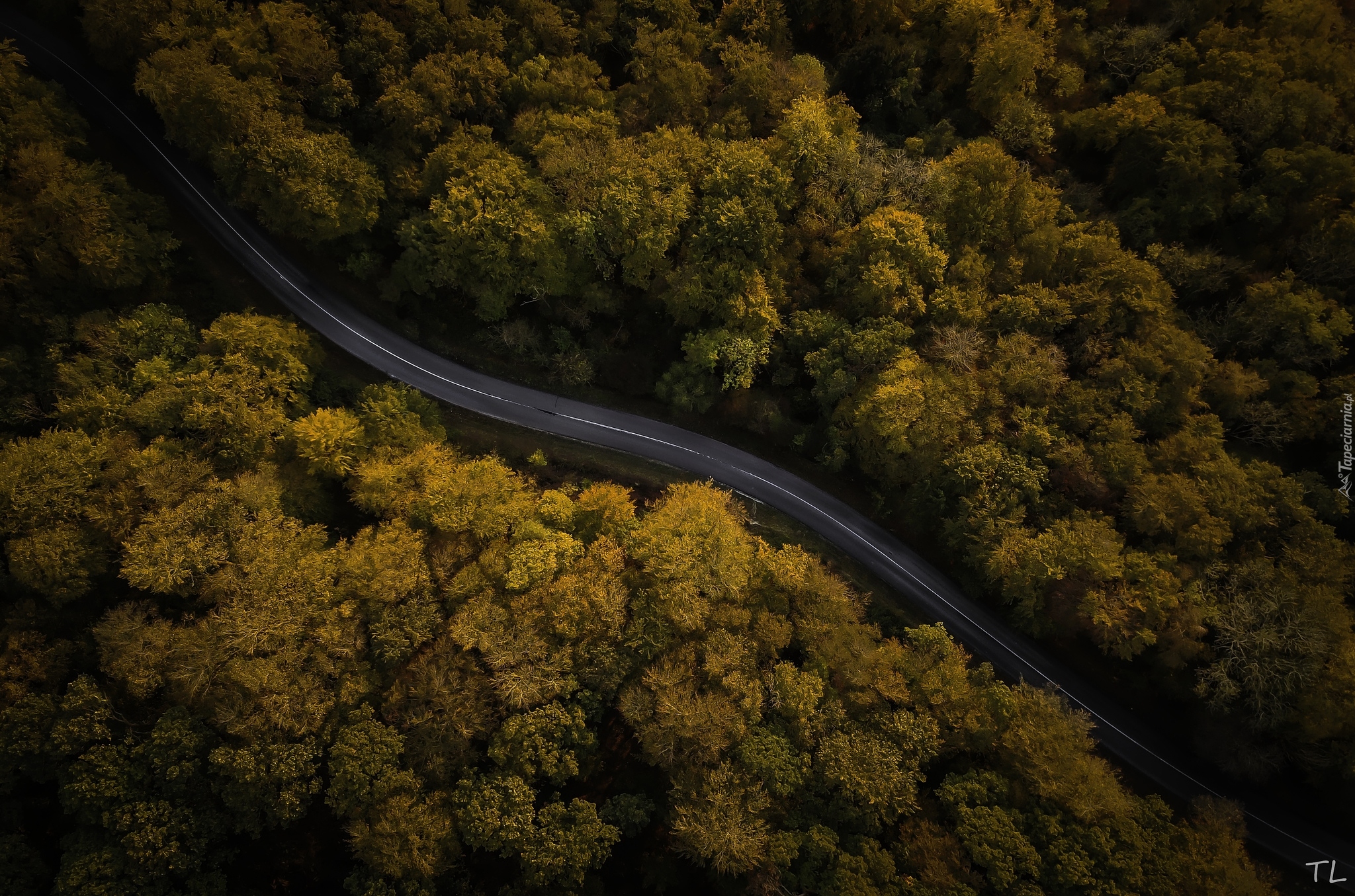 Edytor tapety: Droga przez las widziana z lotu ptaka