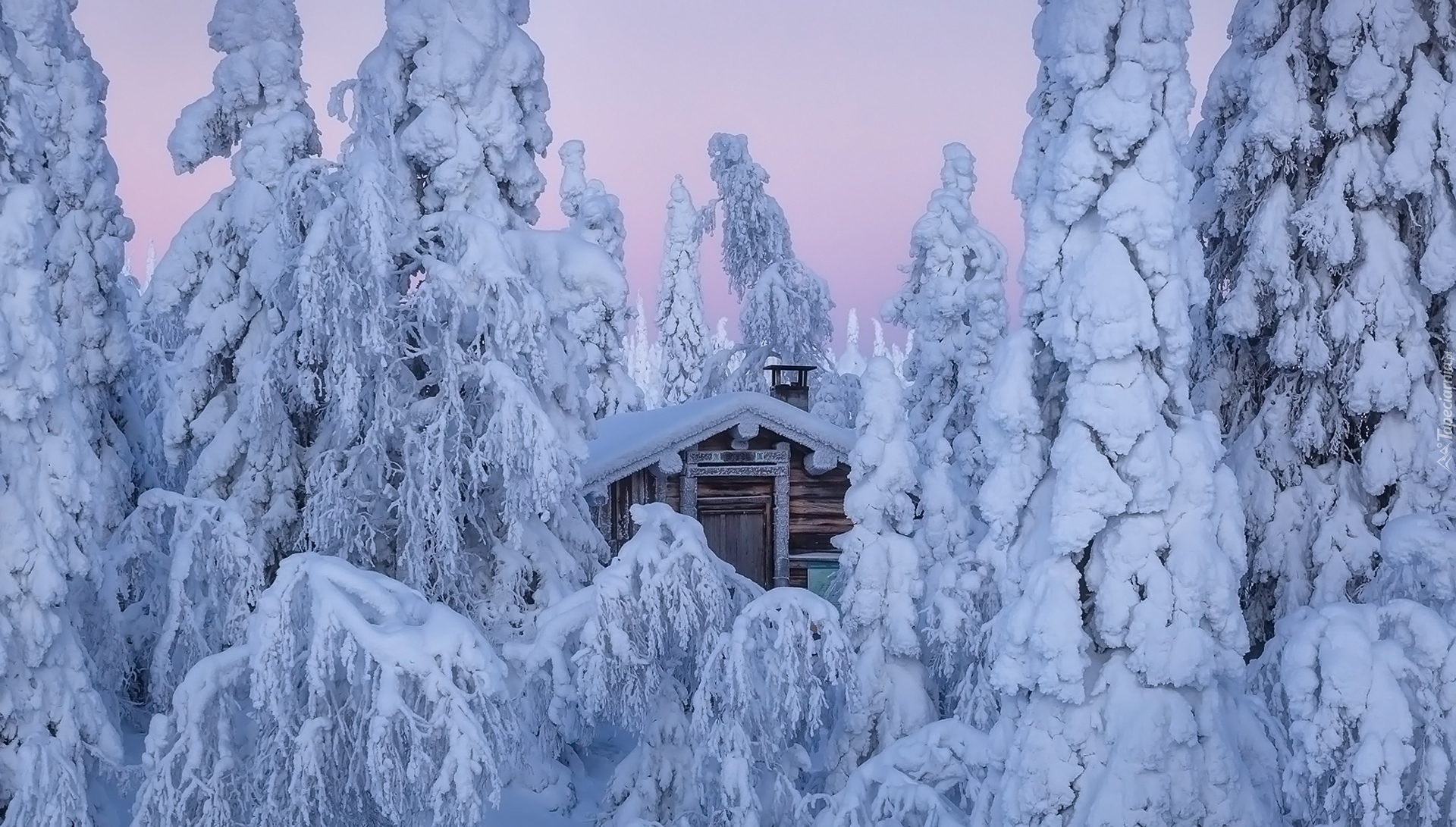 Edytor tapety: Domek ukryty między ośnieżonymi drzewami