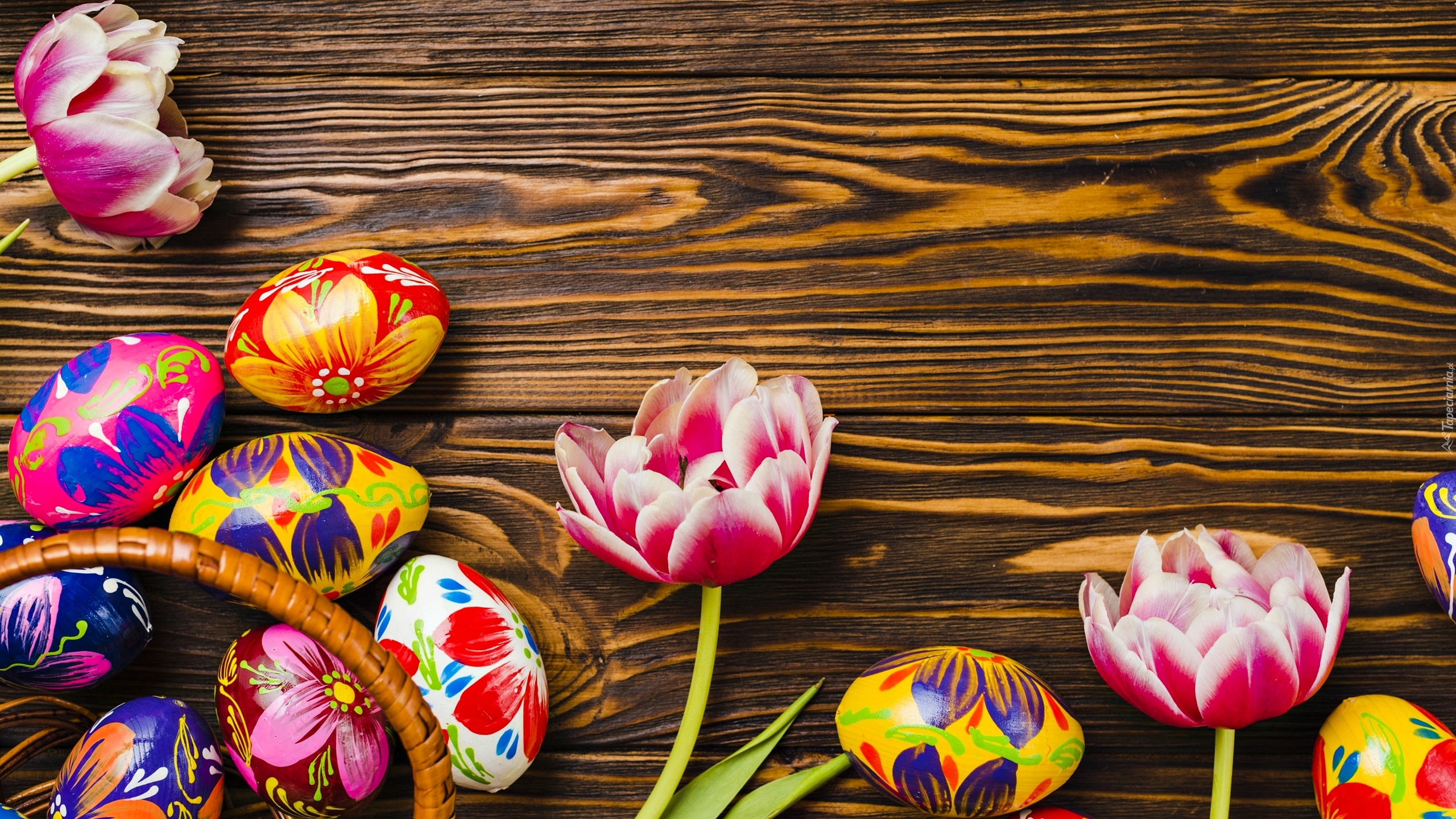 Edytor tapety: Kolorowe tulipany i barwne pisanki