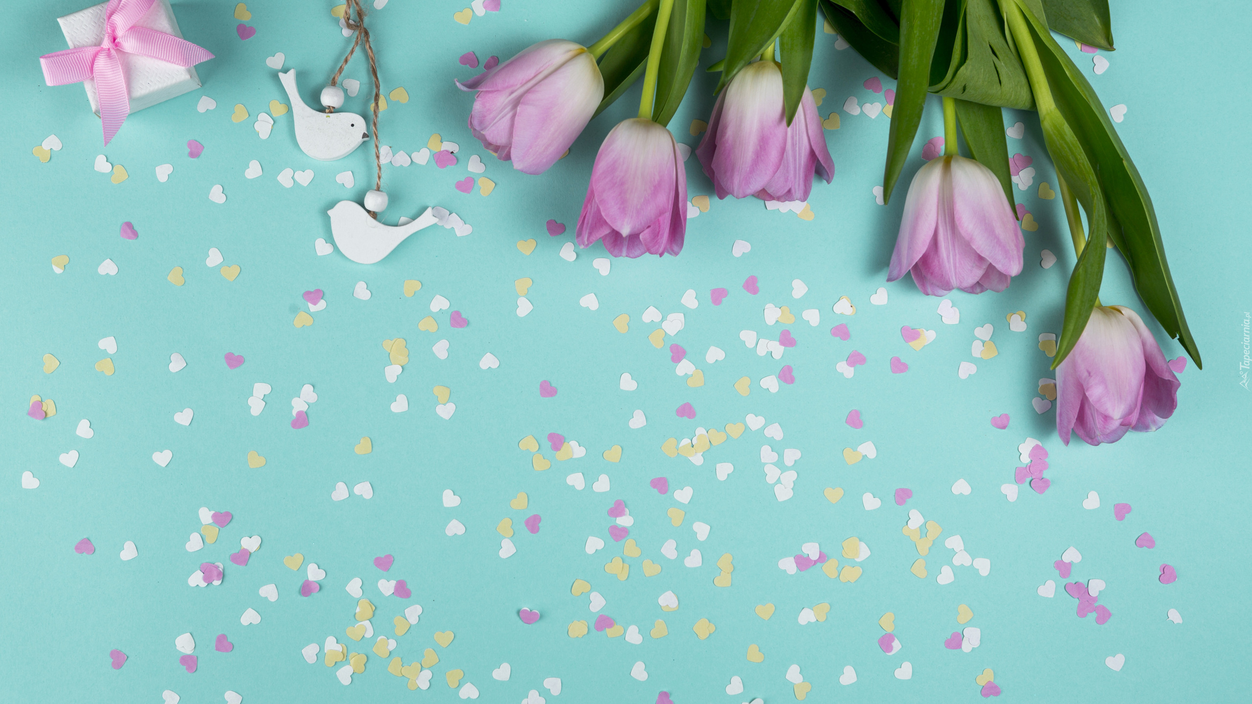 Edytor tapety: Tulipany na tle rozsypanych serduszek