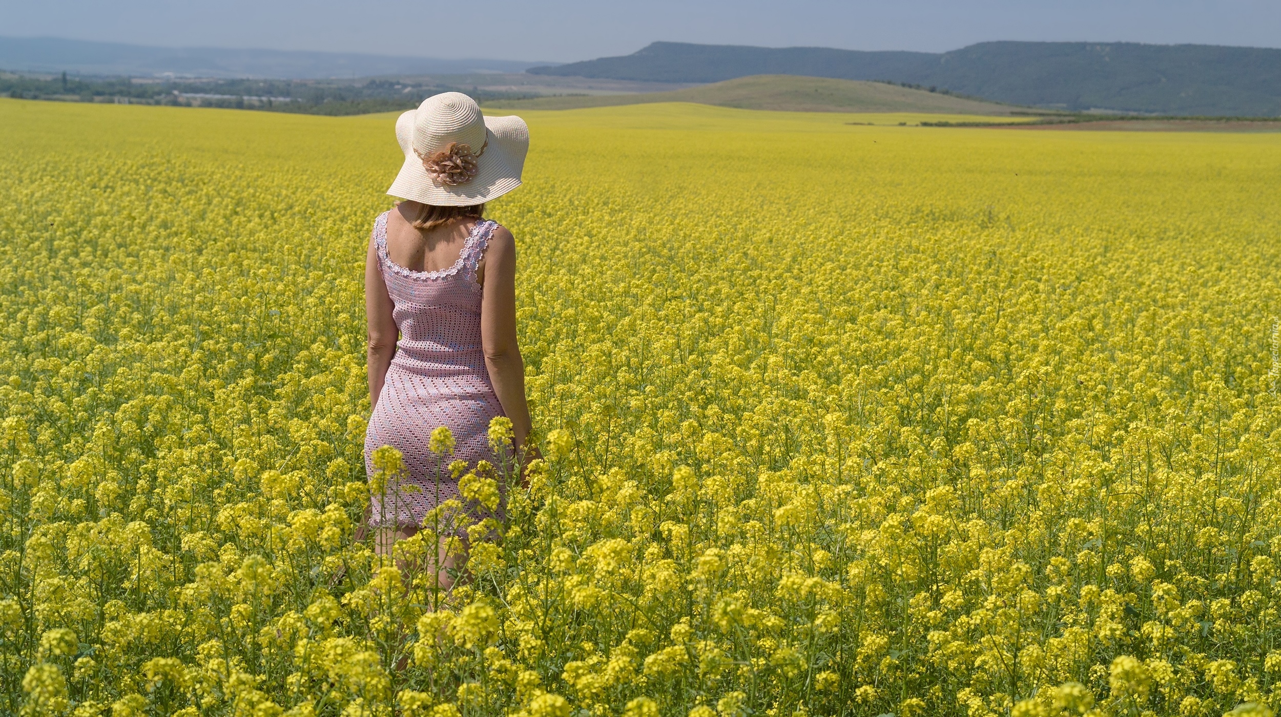 Edytor tapety: Kobieta w kapeluszu na rzepakowym polu