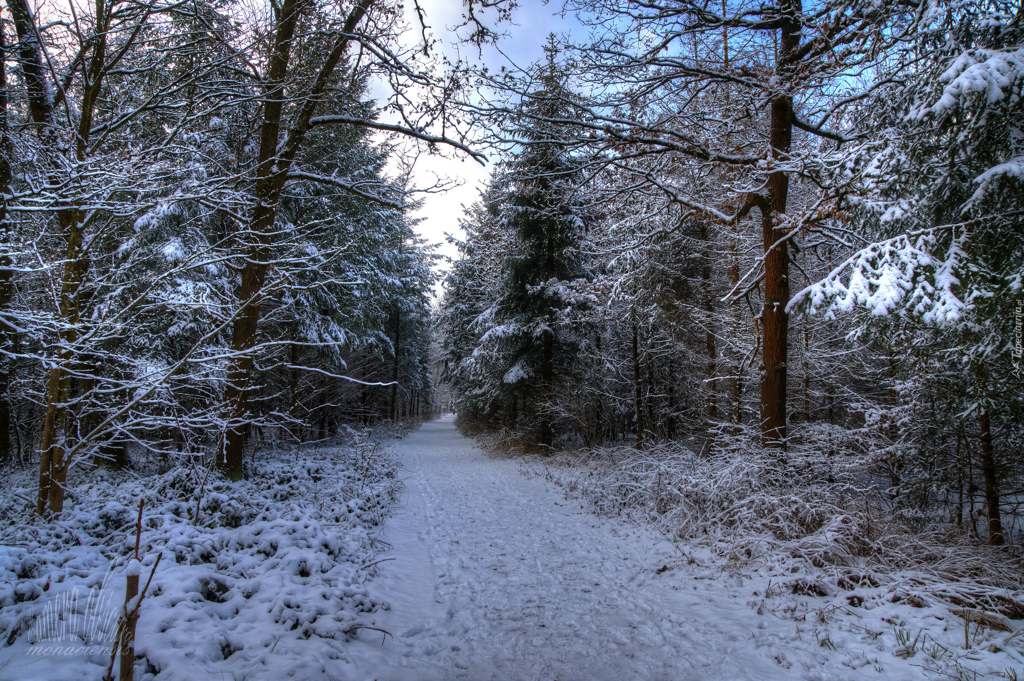 Edytor tapety: Ośnieżona droga w środku lasu