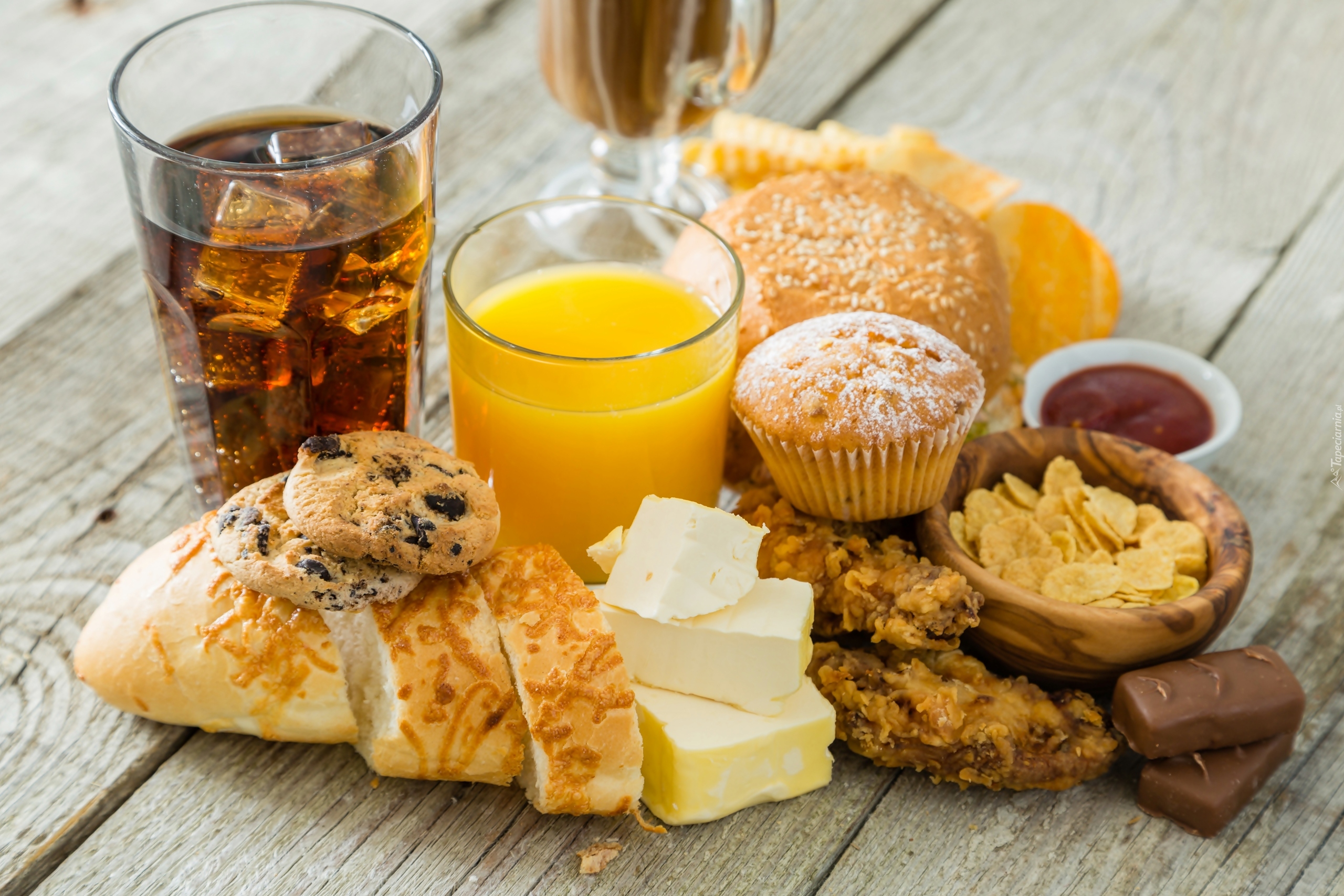 Edytor tapety: Napoje w szklankach obok bułki i babeczki