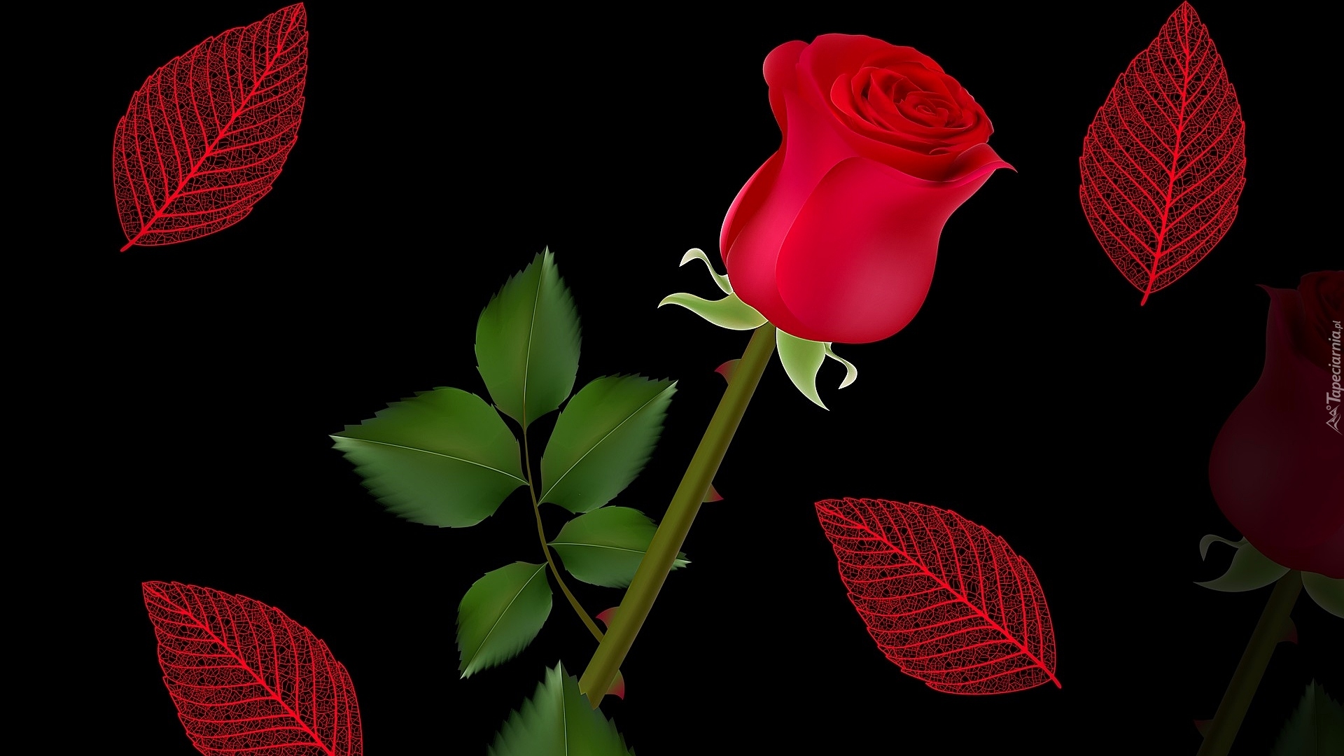 Edytor tapety: Czerwona róża z liśćmi