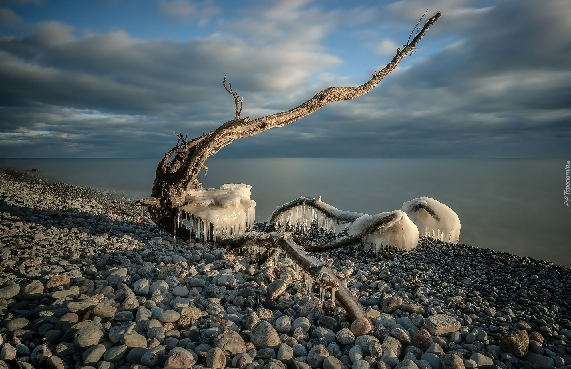 Edytor tapety: Oblodzona gałąź na kamienistym brzegu morza