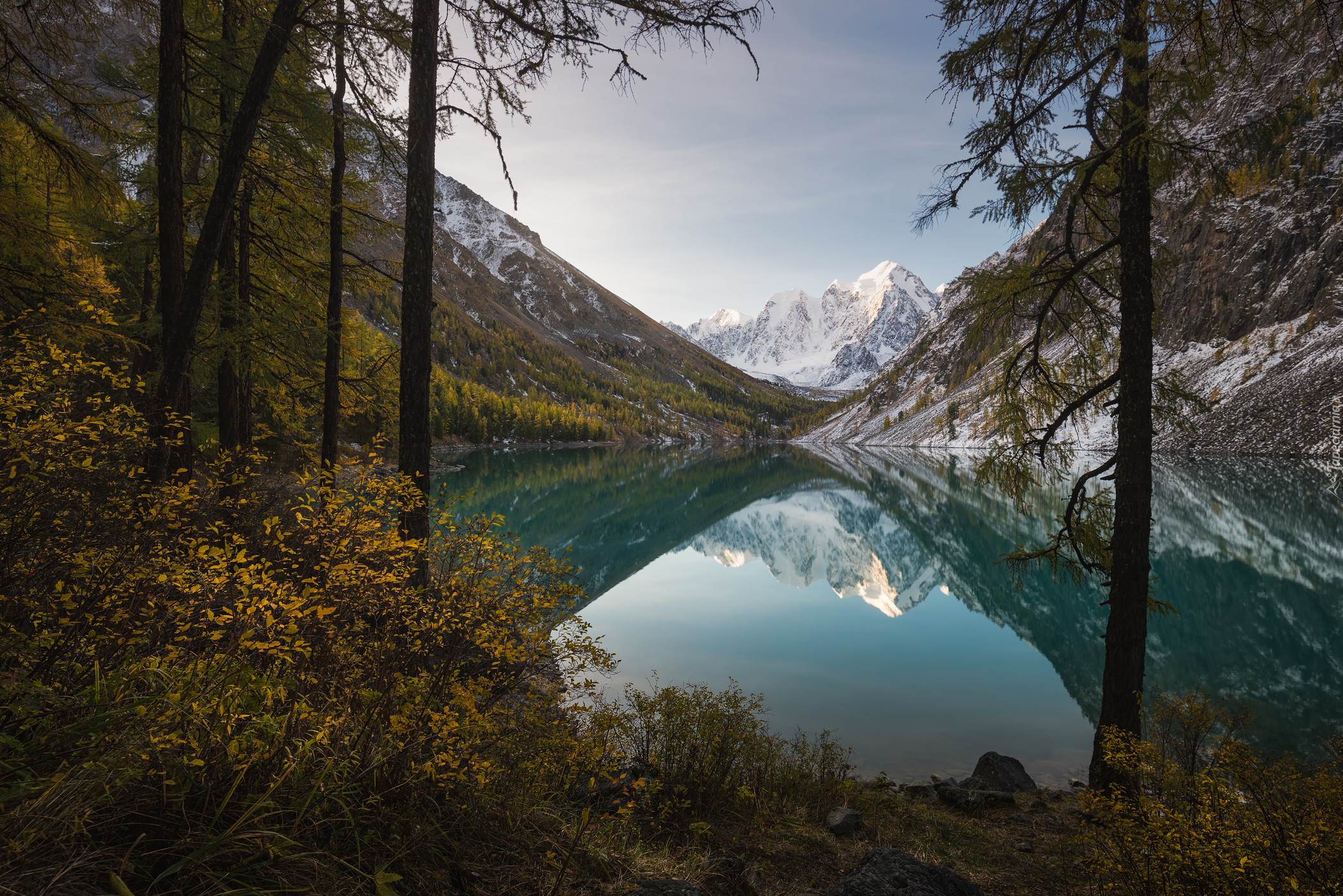 Edytor tapety: Drzewa i góry wokół jeziora Szawlińskiego w Rosji