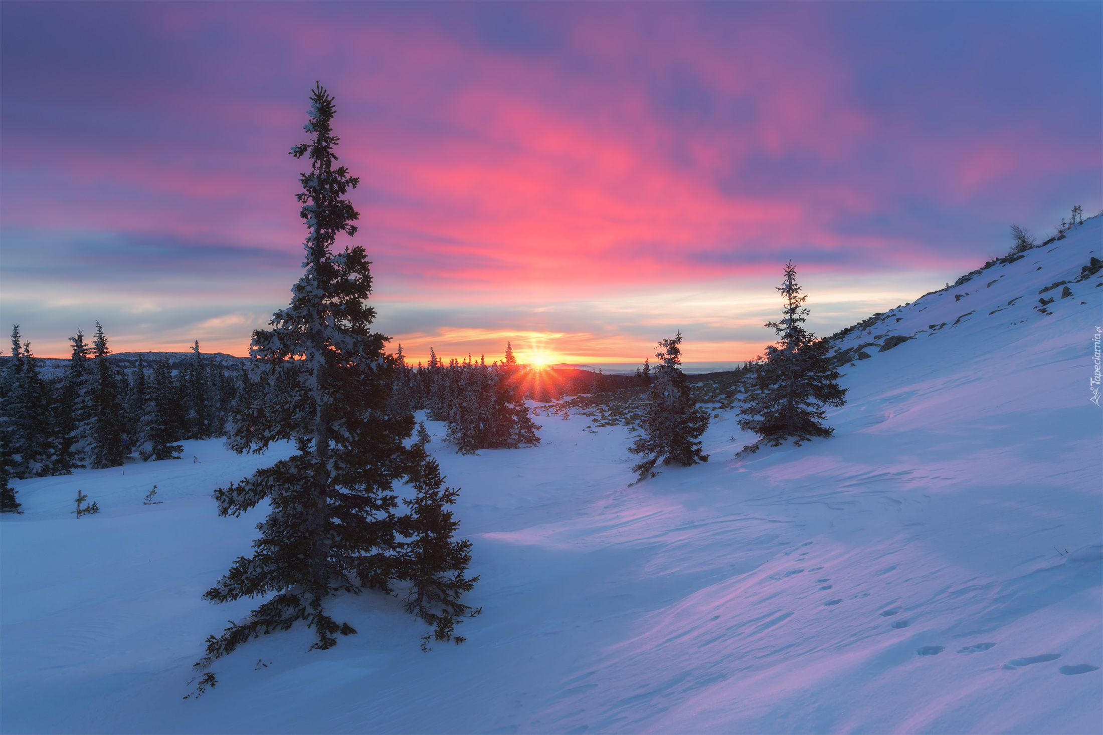 Edytor tapety: Zachód słońca nad zimowym wzgórzem z drzewami