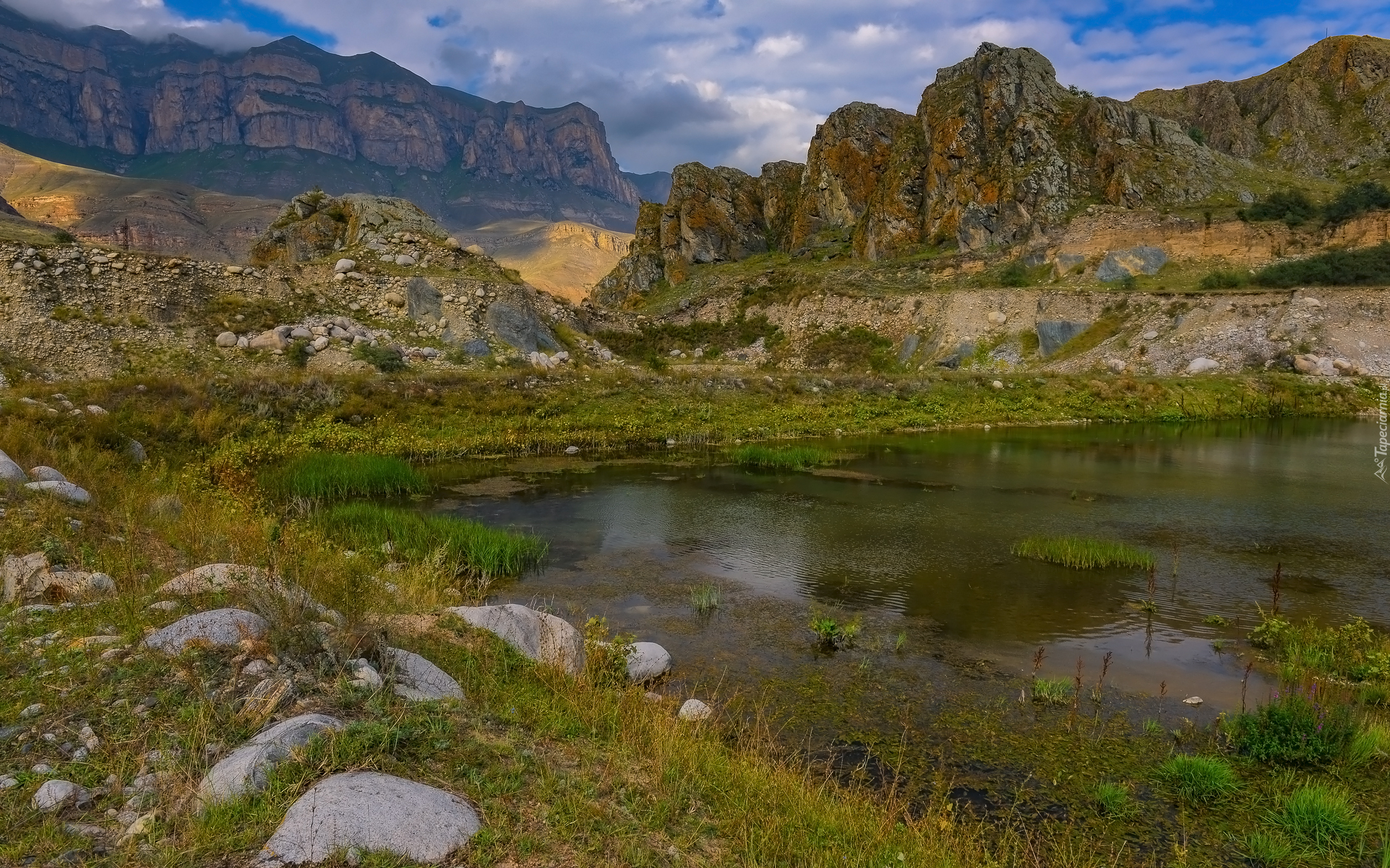 Edytor tapety: Skały i kamienie nad jeziorkiem w górach