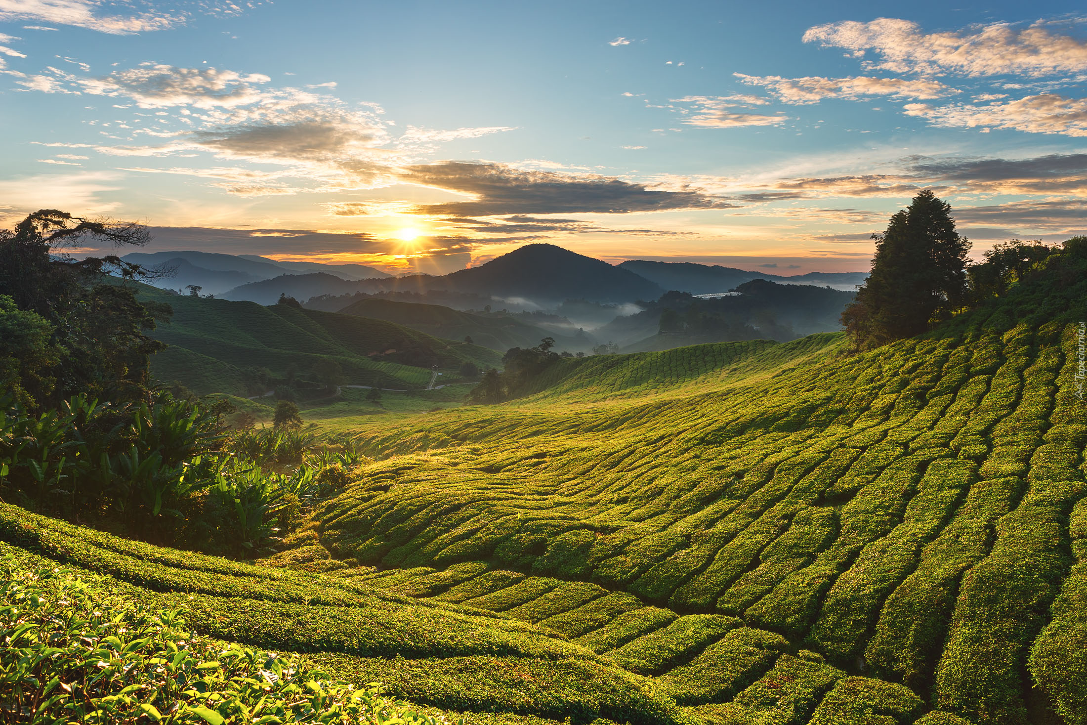 Edytor tapety: Plantacja herbaty w Cameron Highlands o wschodzie słońca