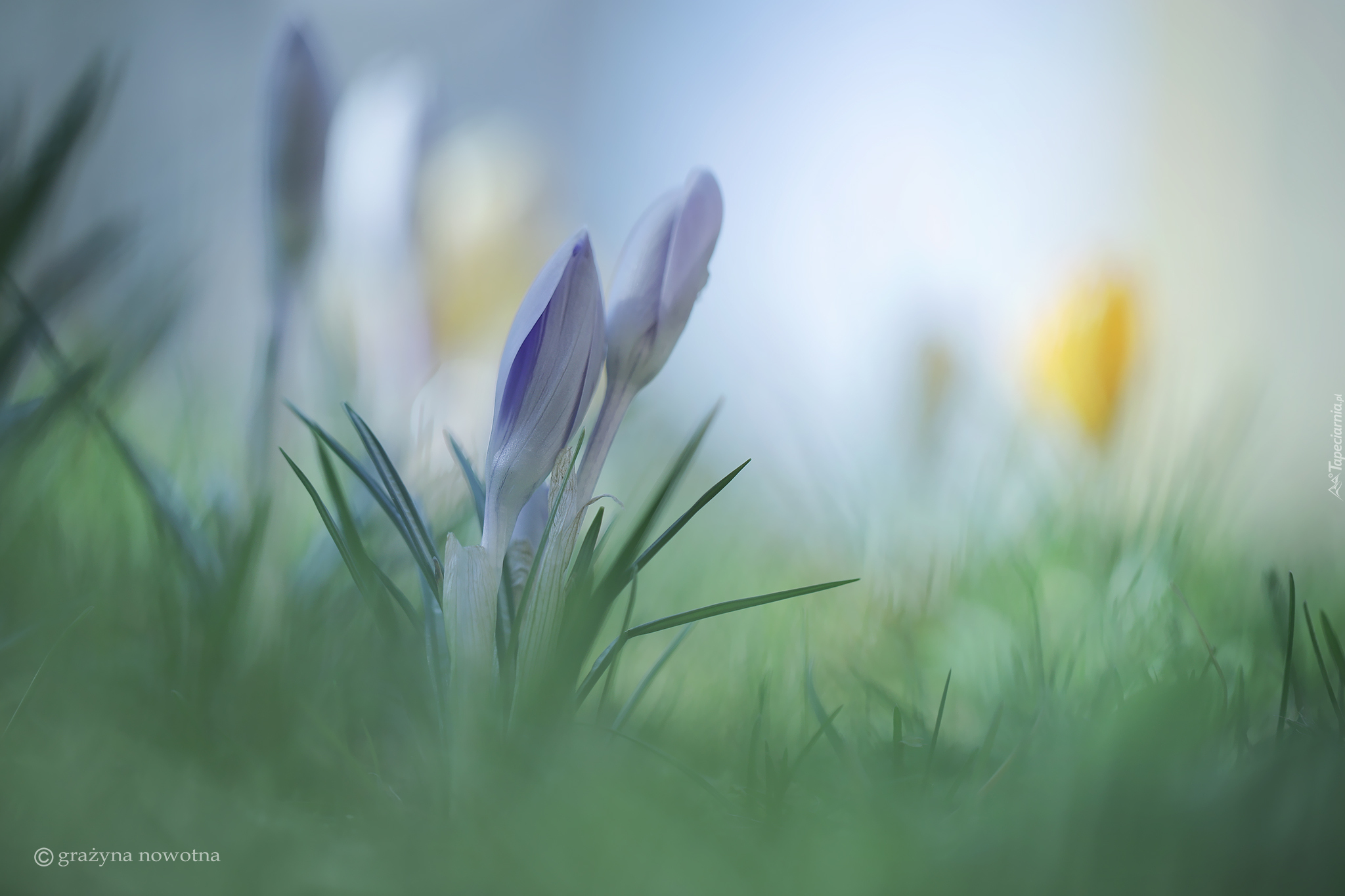 Edytor tapety: Pąki niebieskich krokusów w trawie