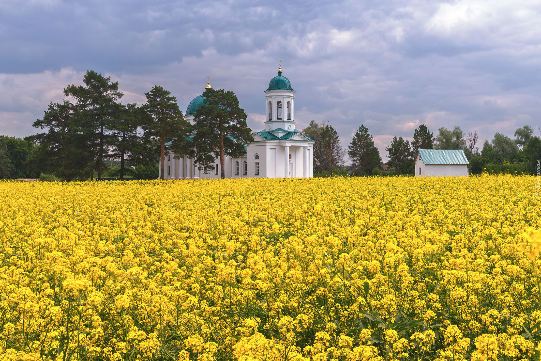 Edytor tapety: Kościół z zielonym dachem obok pola rzepaku