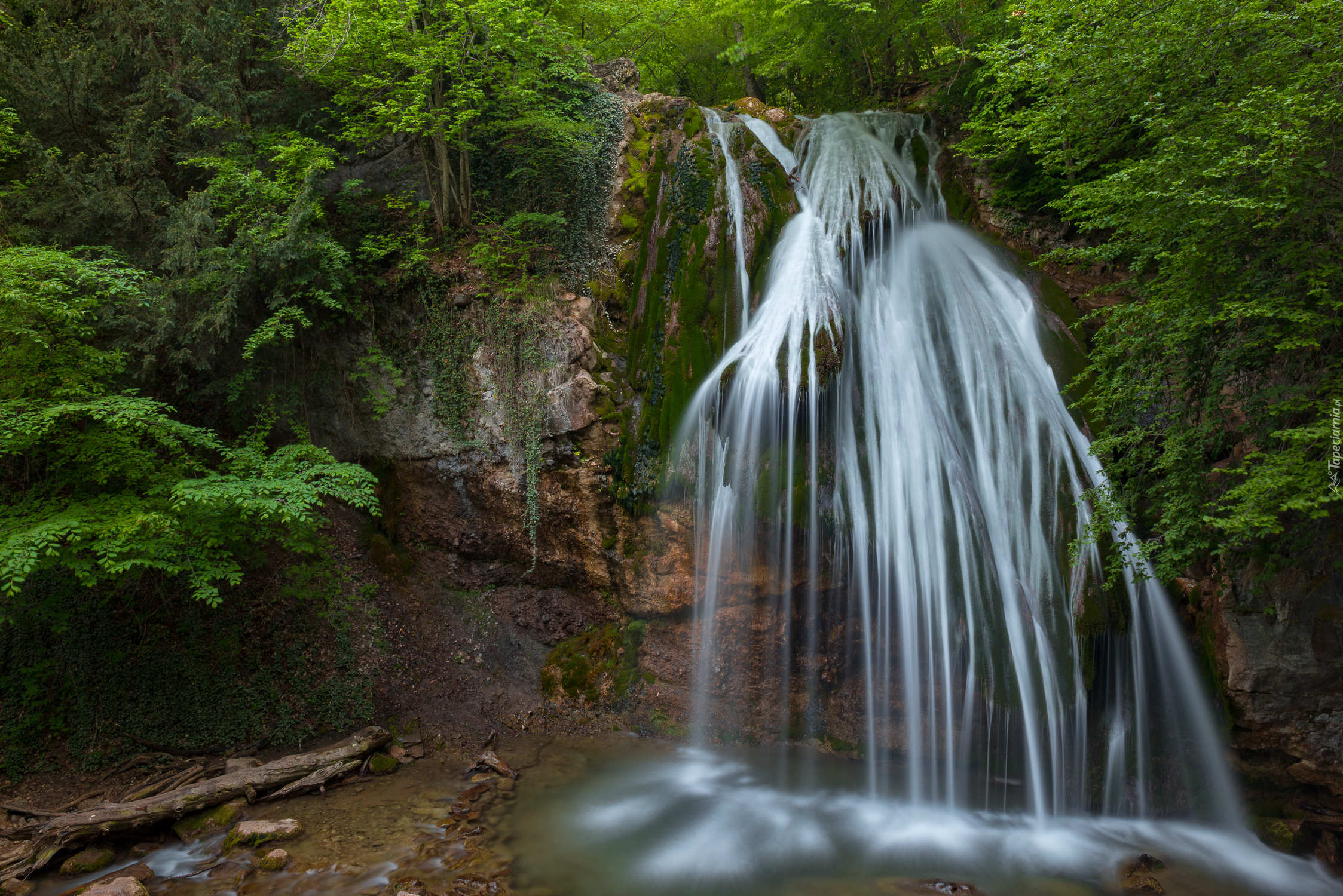Edytor tapety: Leśny wodospad obmywający skały