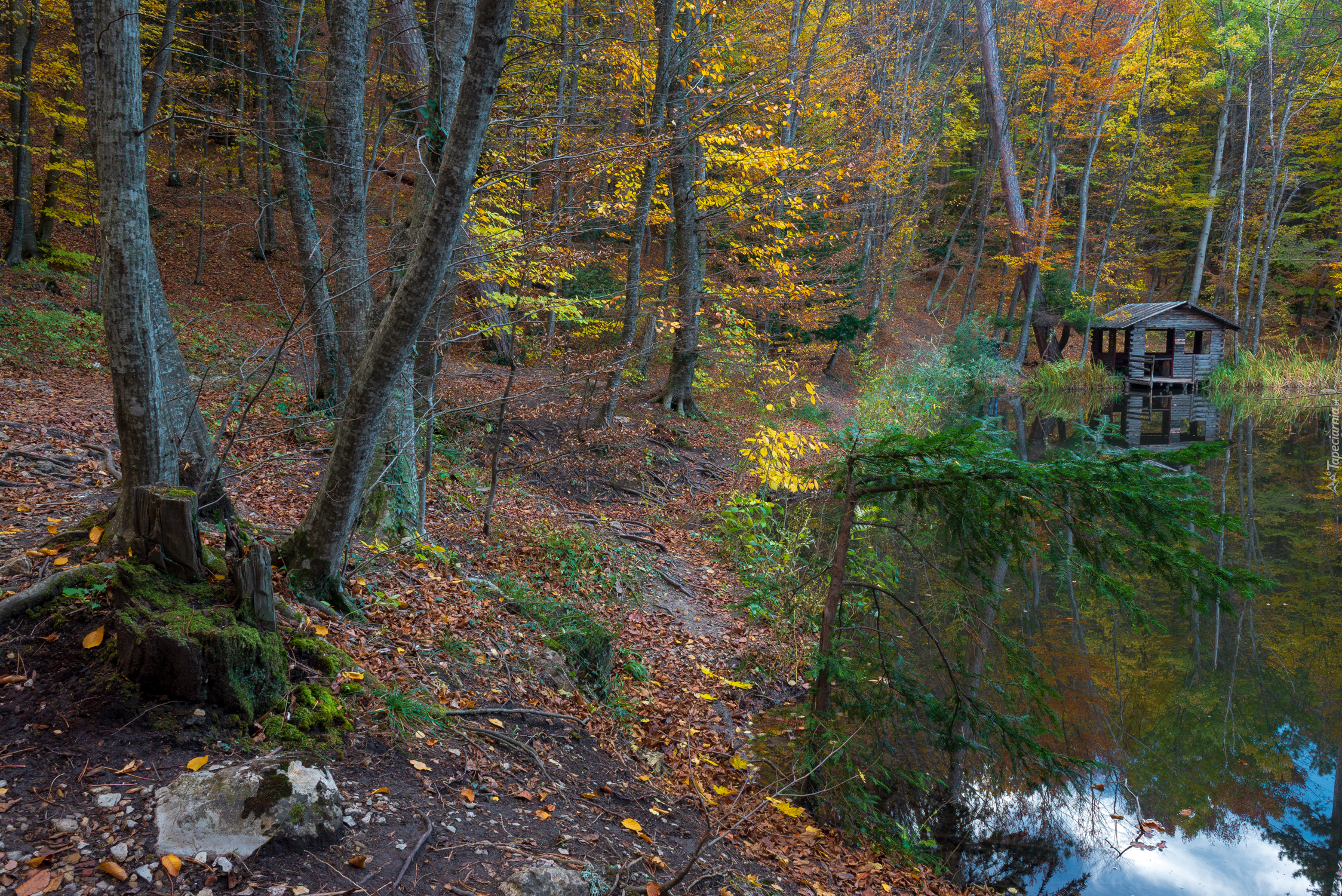 Edytor tapety: Altanka przy brzegu jeziora w środku lasu