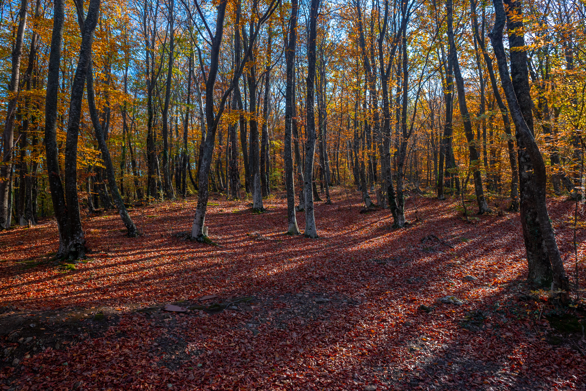 Edytor tapety: Jesienne liście opadły pod drzewa w lesie