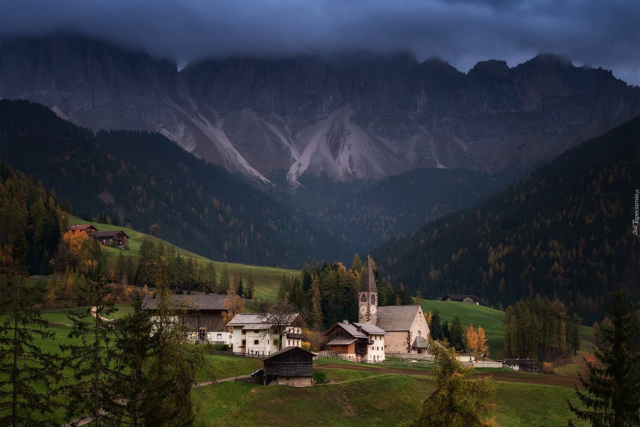 Edytor tapety: Budynki obok kościoła we włoskiej wsi Santa Maddalena