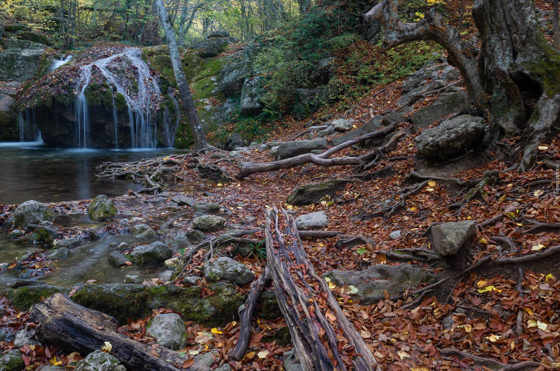 Edytor tapety: Woda spływająca po omszałej skale do leśnej rzeki