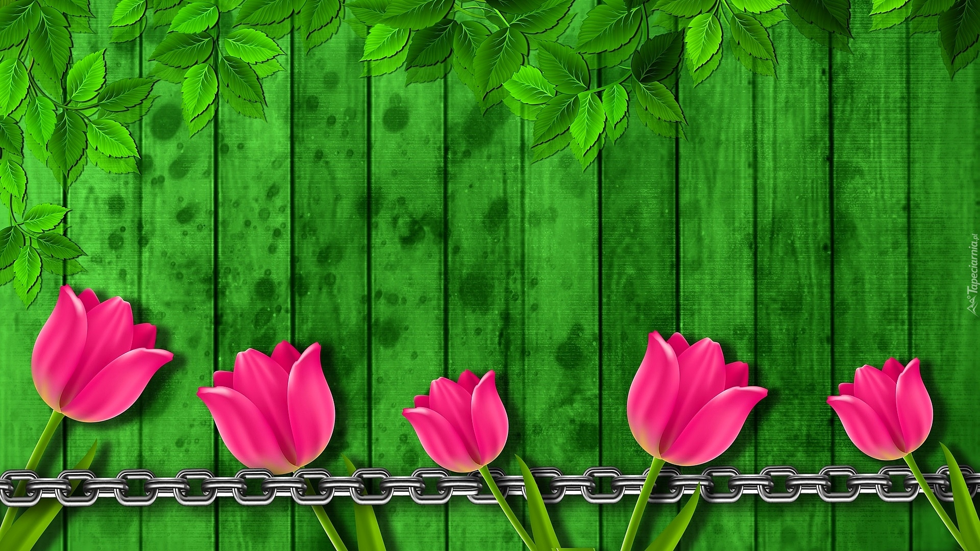 Edytor tapety: Tulipany z łańcuchem na deskach