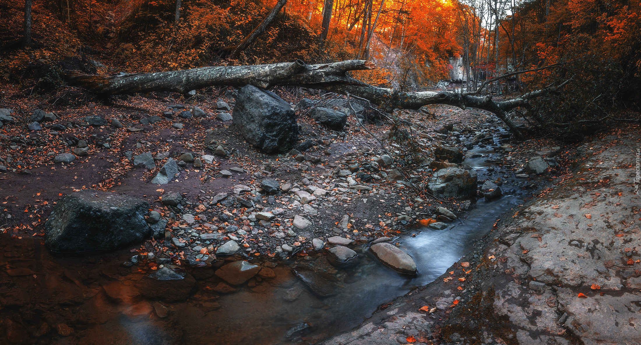 Edytor tapety: Powalone drzewo nad leśnym strumykiem