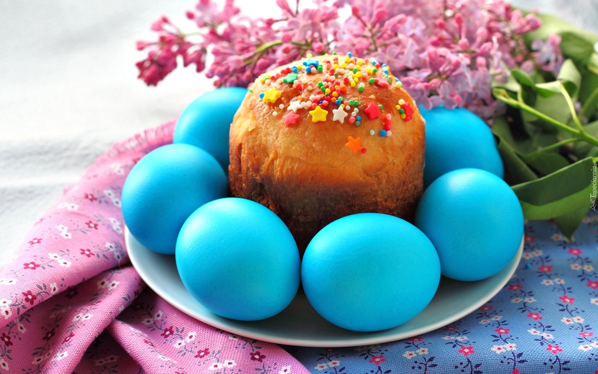 Edytor tapety: Niebieskie pisanki ułożone na talerzu wokół babki