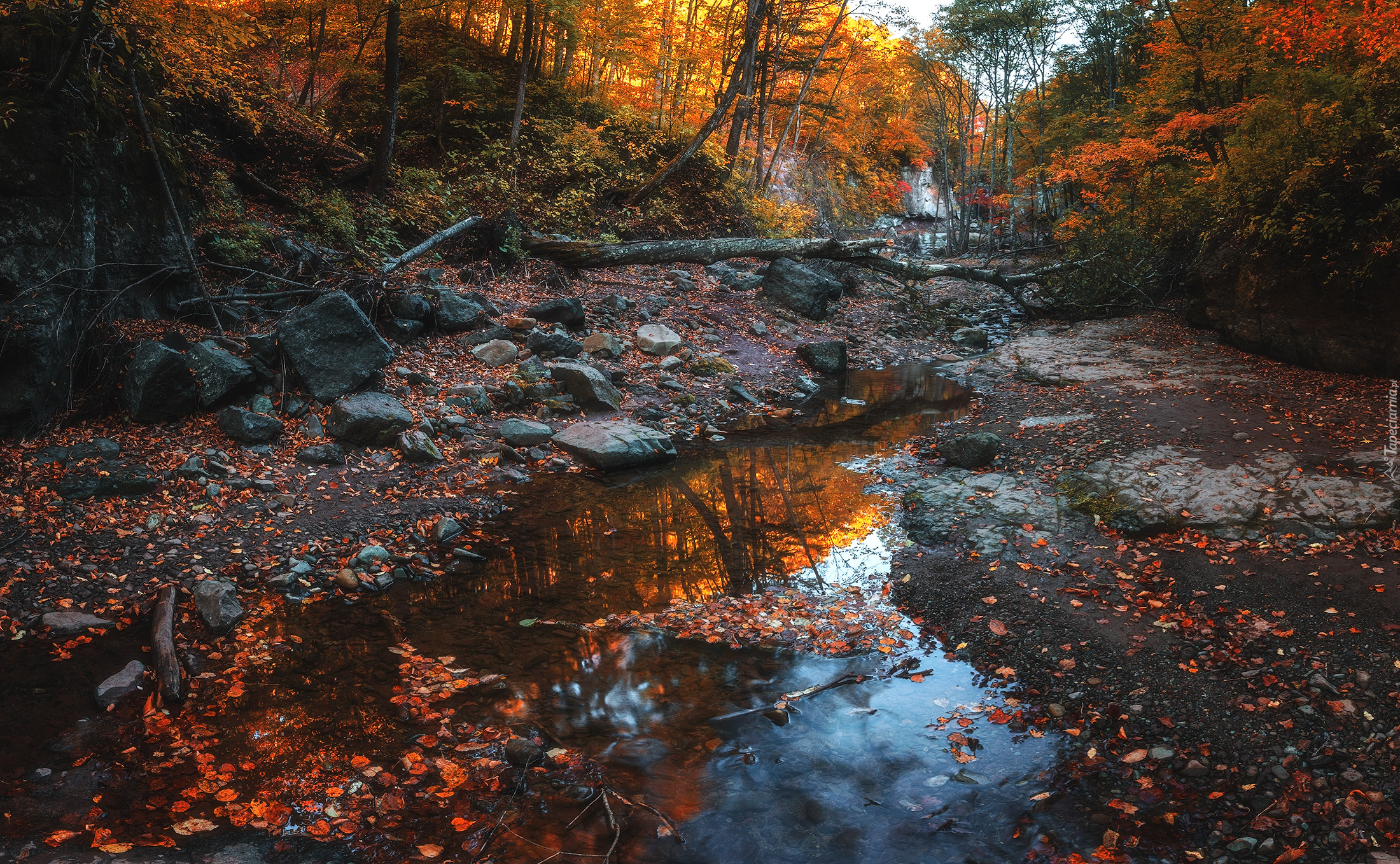 Edytor tapety: Powalone drzewo i kamienie nad leśnym strumykiem