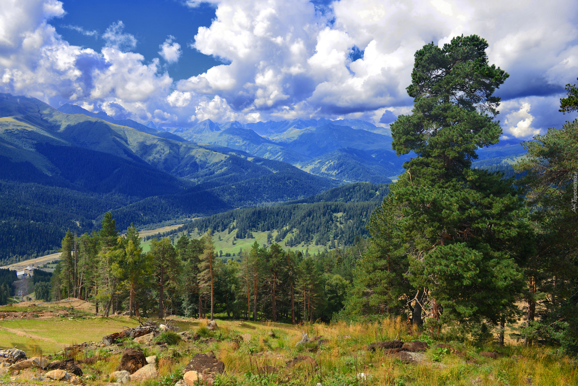 Edytor tapety: Gęste chmury nad górami i lasami