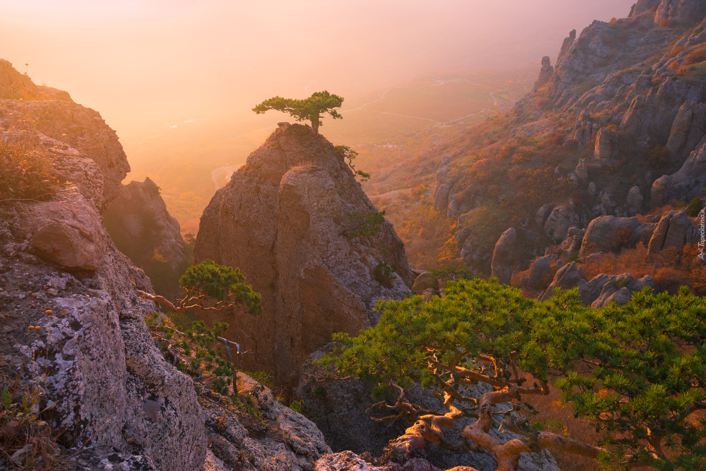 Edytor tapety: Drzewa na skałach we mgle