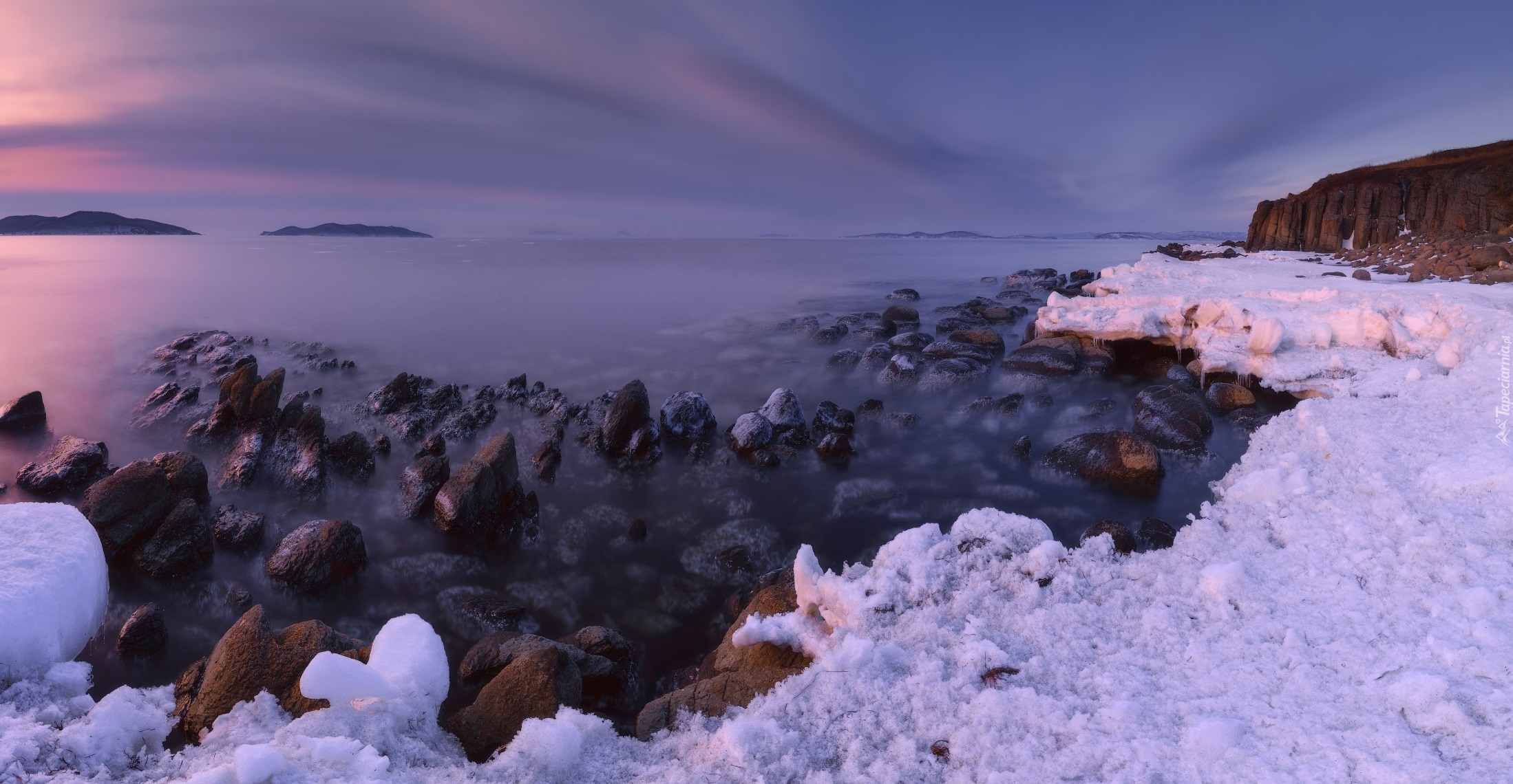 Edytor tapety: Ośnieżone kamienie na brzegu morza Japońskiego