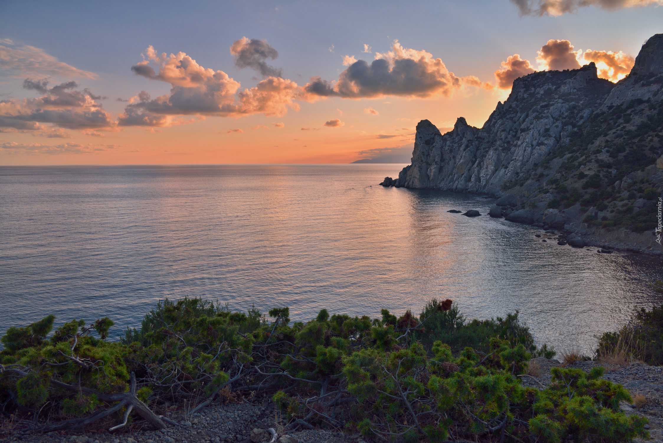 Edytor tapety: Zachód słońca nad morskimi skalami