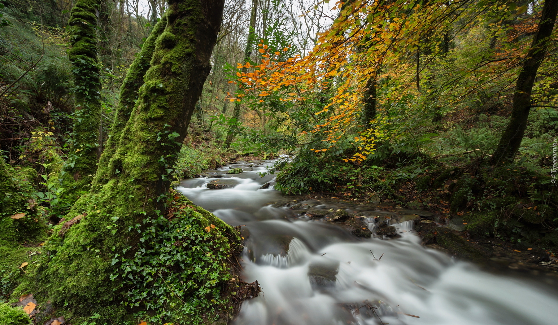 Edytor tapety: Drzewa z omszałymi pniami nad rzeką