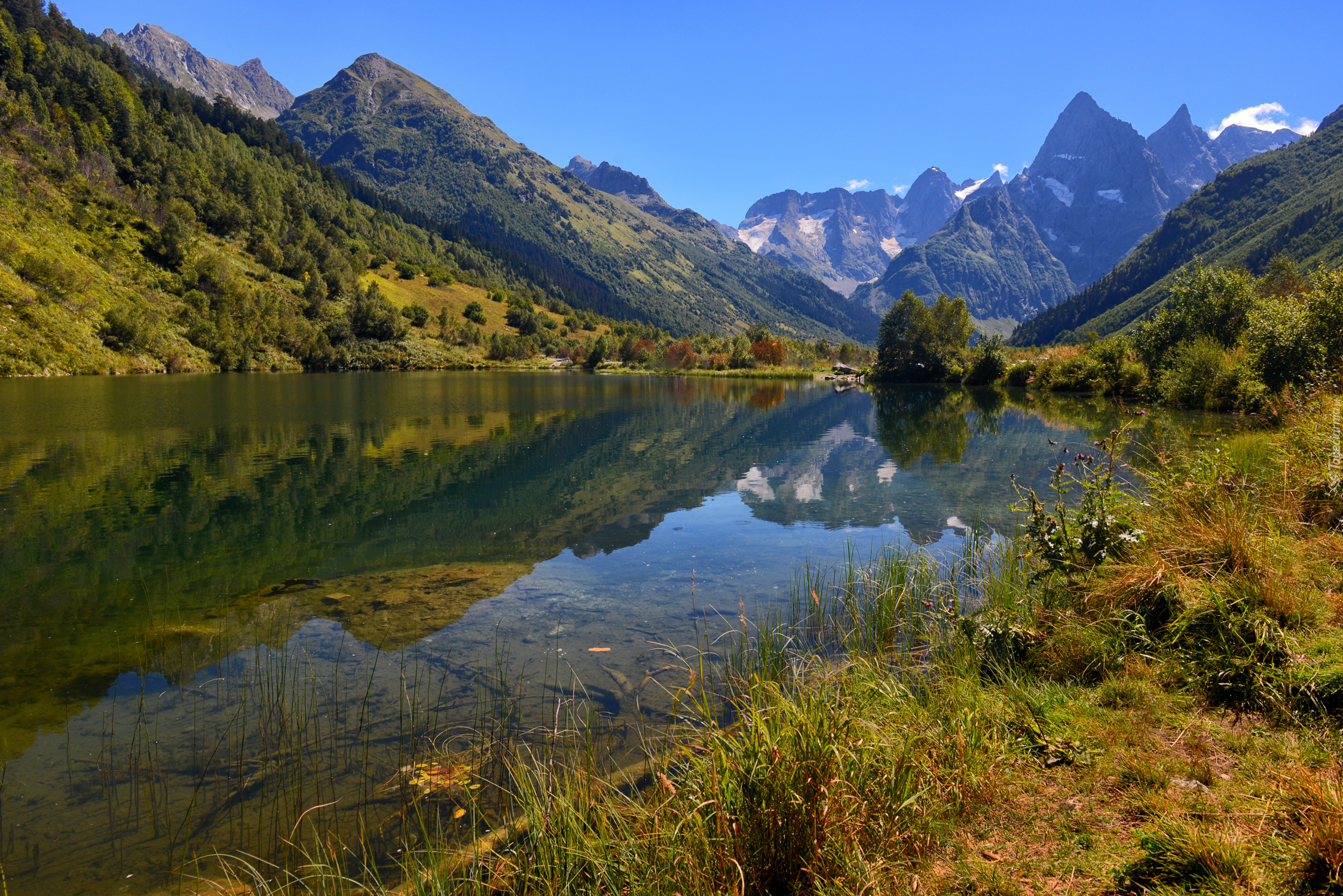 Edytor tapety: Drzewa i krzewy nad górskim jeziorem