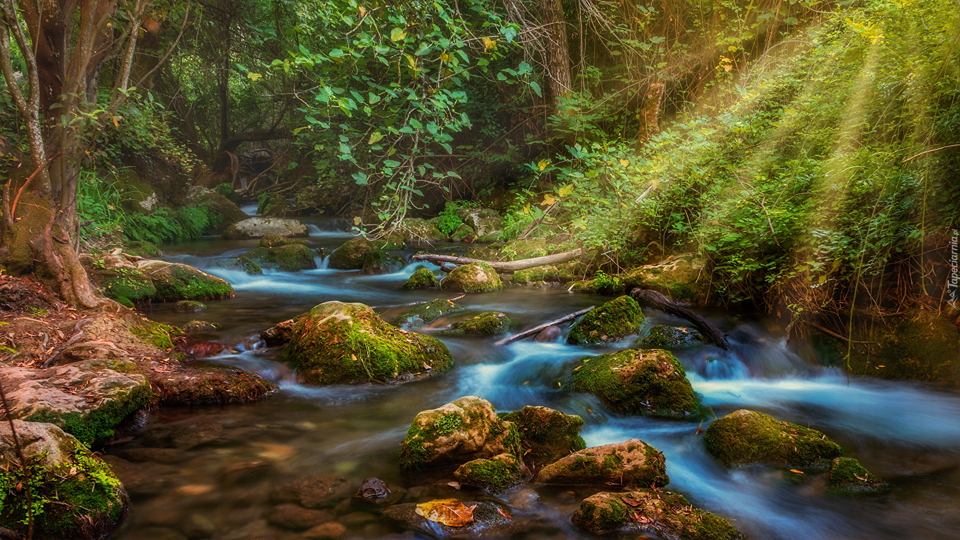 Edytor tapety: Światło promieni słonecznych nad rzeką w lesie
