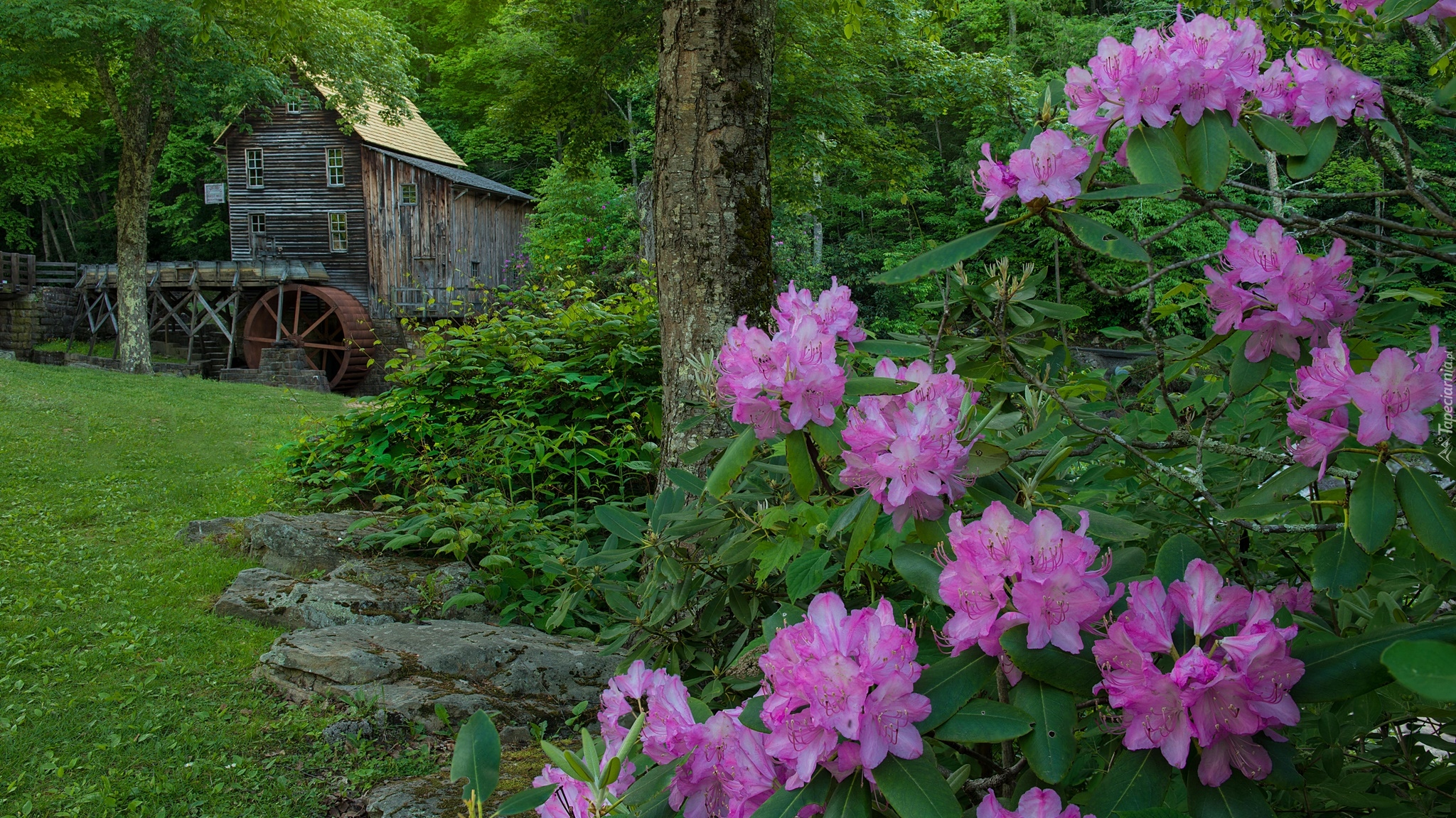 Edytor tapety: Różanecznik na tla starego młyna