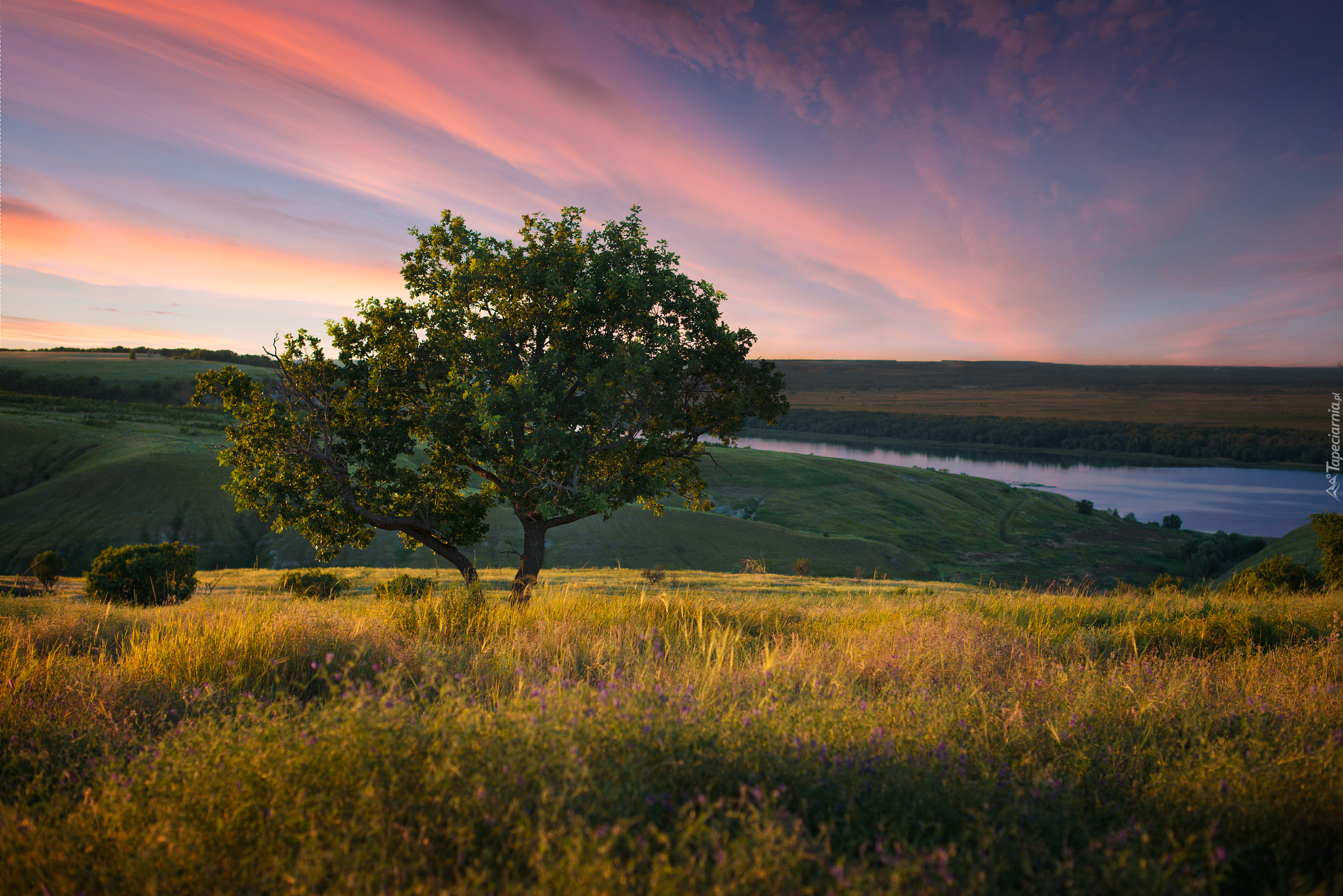 Edytor tapety: Drzewa rosnące blisko siebie na łące niedaleko rzeki