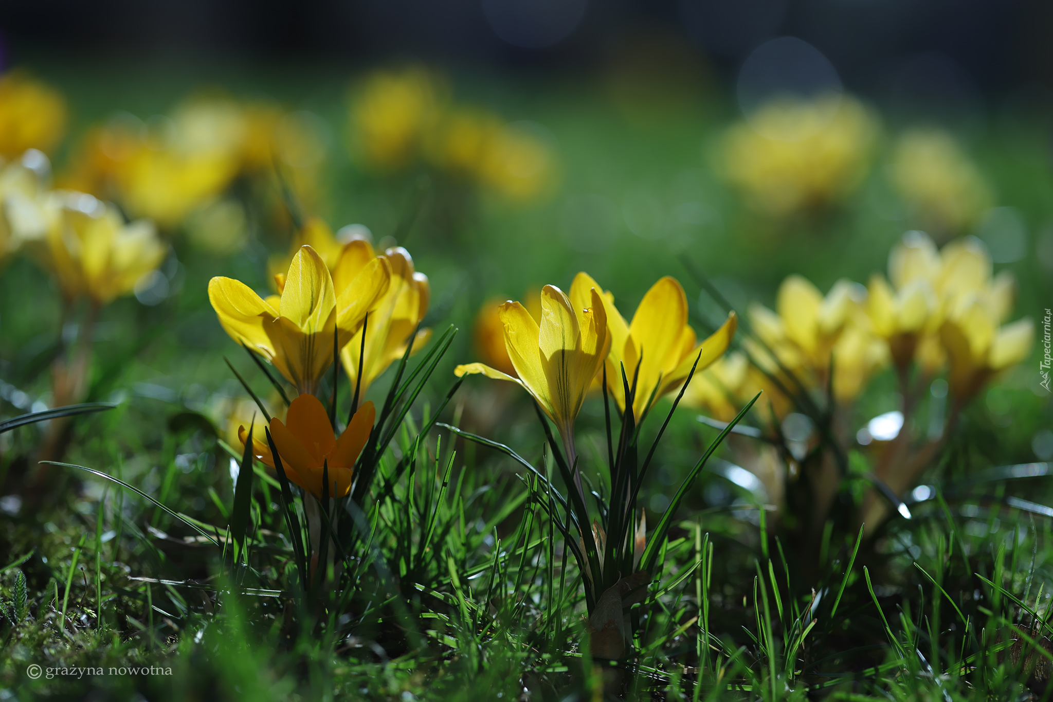 Edytor tapety: Żółte krokusy wiosenne w trawie
