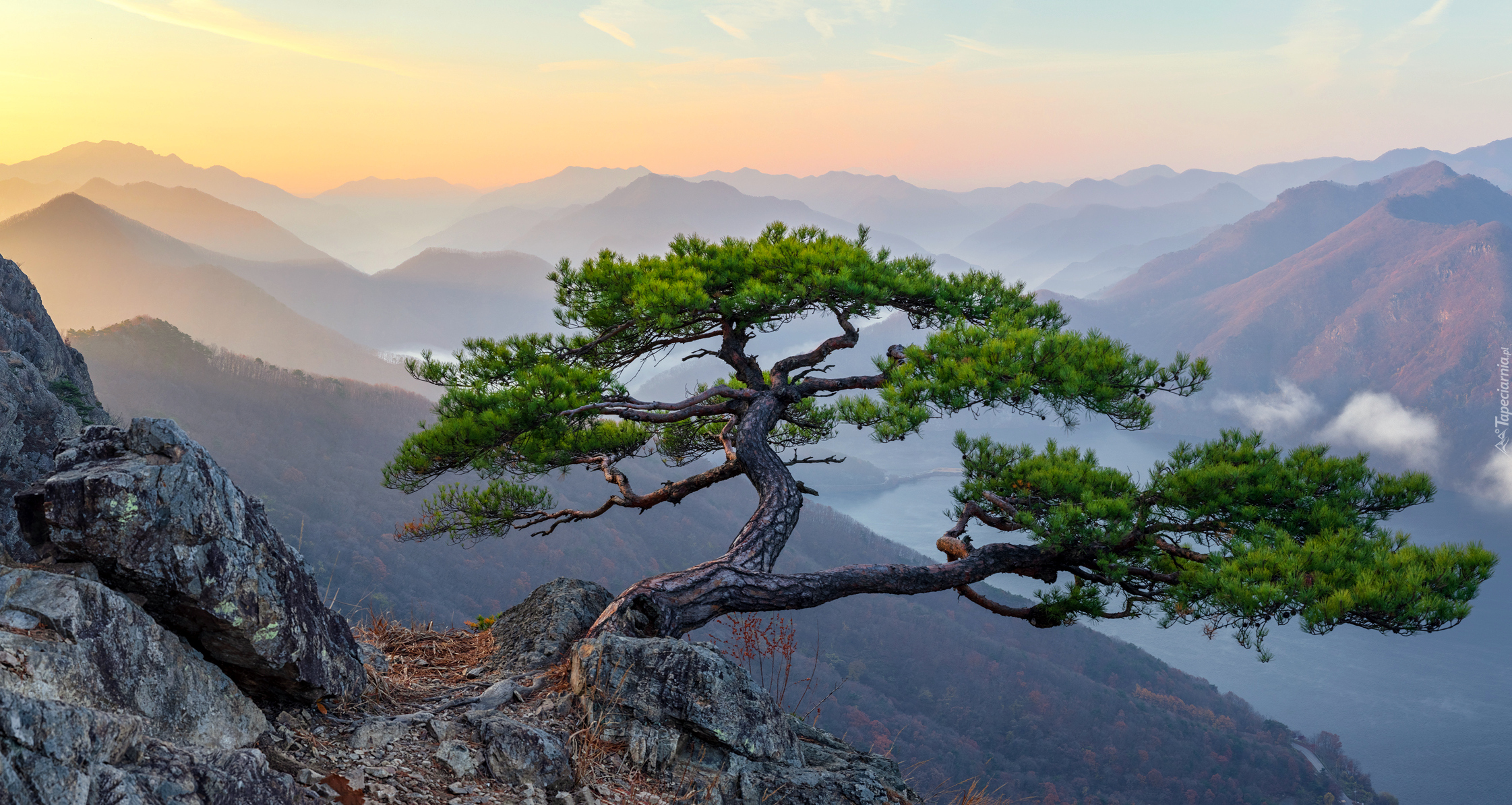 Edytor tapety: Pochylona sosna na skale