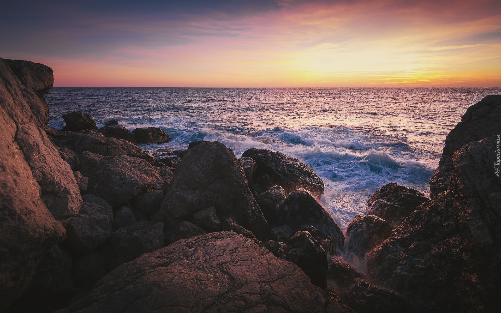 Edytor tapety: Skały na tle morza o zachodzie słońca