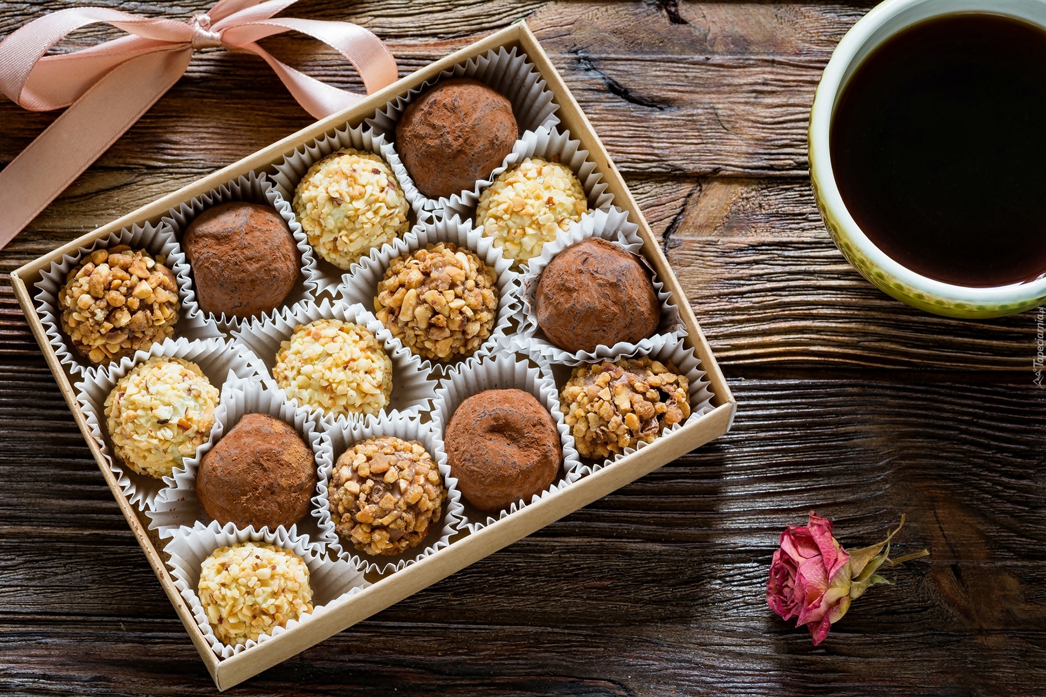 Edytor tapety: Pudełko czekoladek obok kubka i różyczki