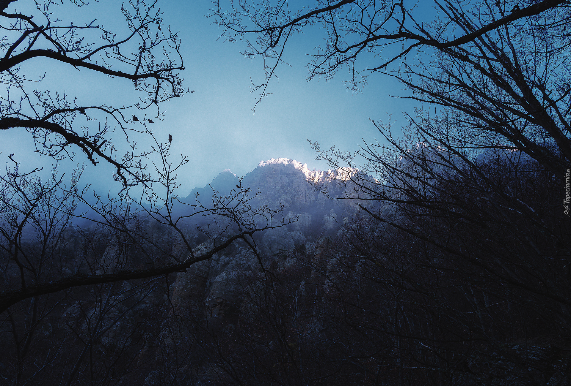Edytor tapety: Gałęzie drzew na tle gór