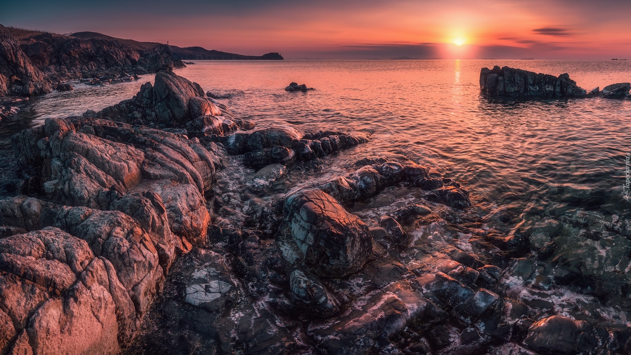 Edytor tapety: Skały na wybrzeżu morza Japońskiego o wschodzie słońca