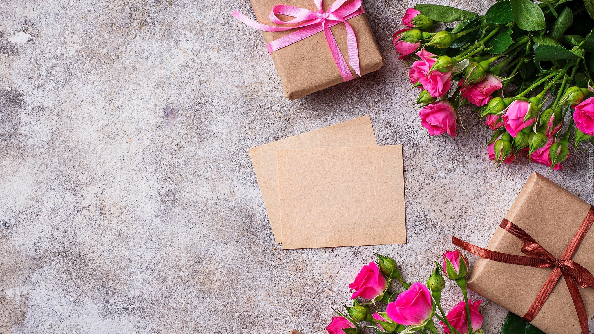Edytor tapety: Różowe róże z pąkami i prezentami
