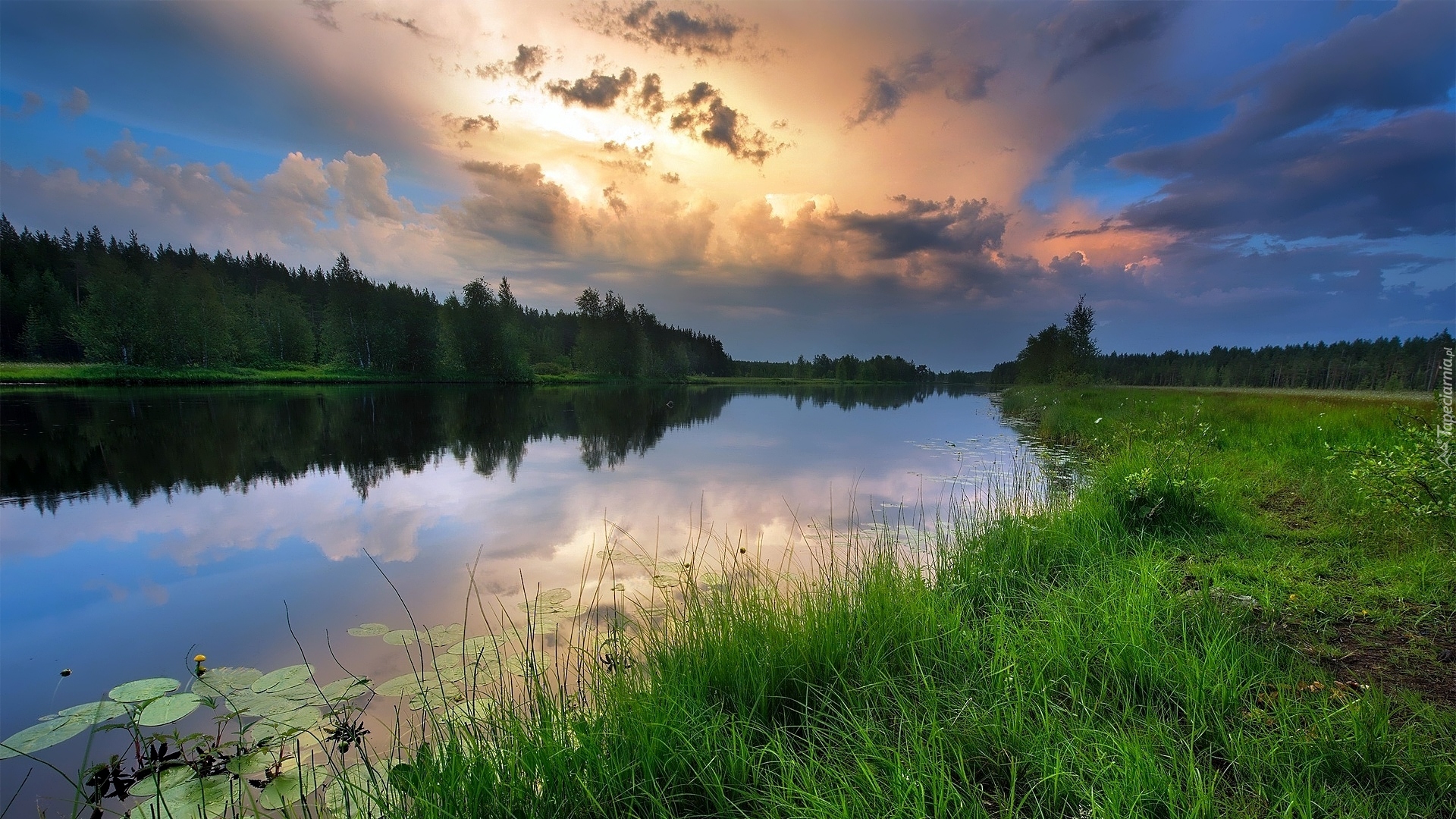 Edytor tapety: Zielona trawa nad rzeką