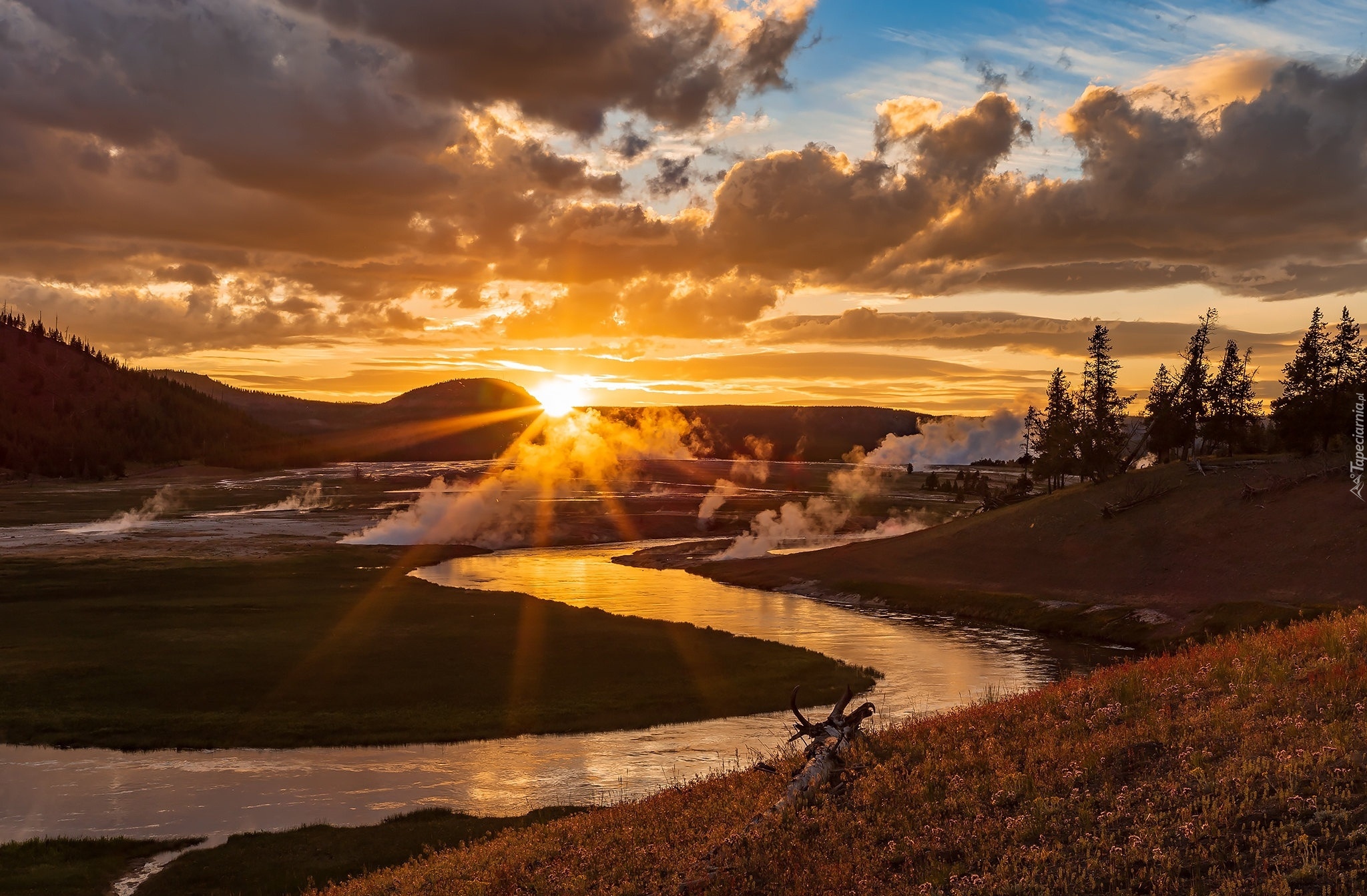 Edytor tapety: Wzgórza i rzeka w blasku zachodzącego słońca
