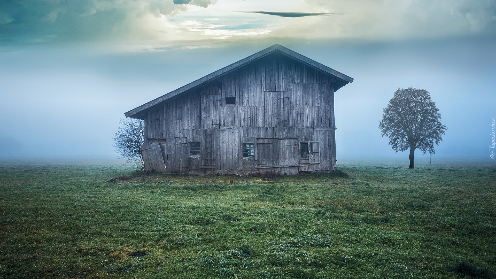 Edytor tapety: Drewniana szopa na łące