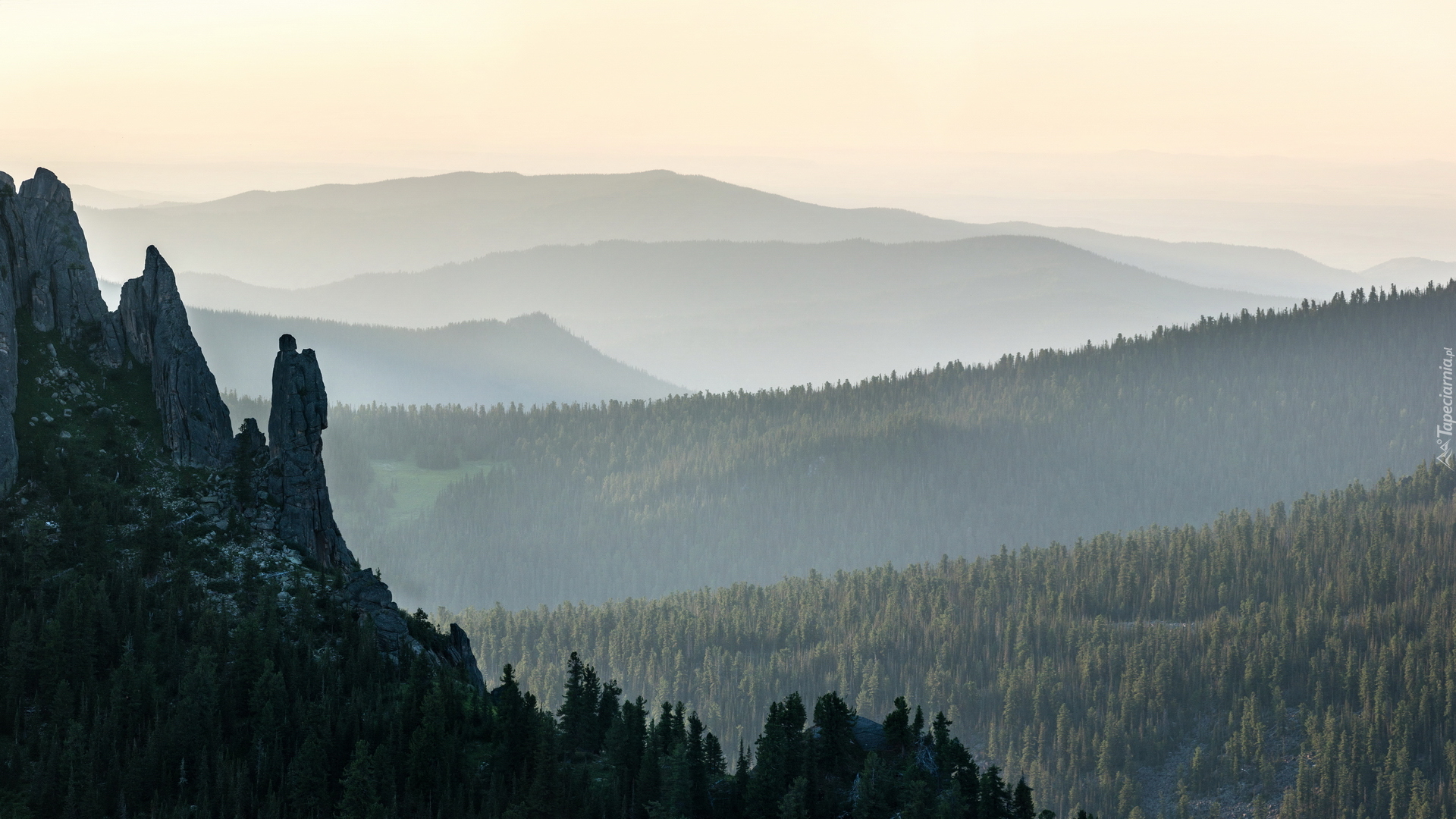Edytor tapety: Skały z widokiem na zamglone góry